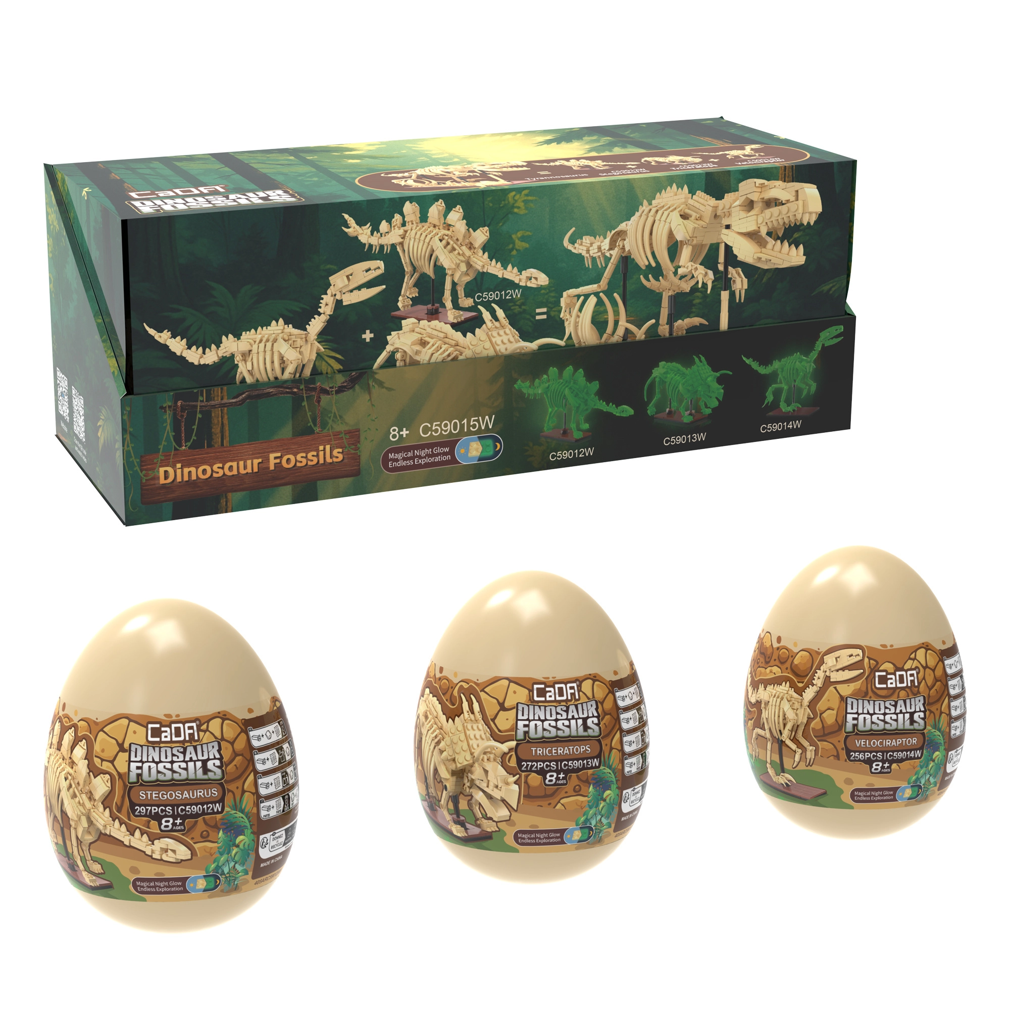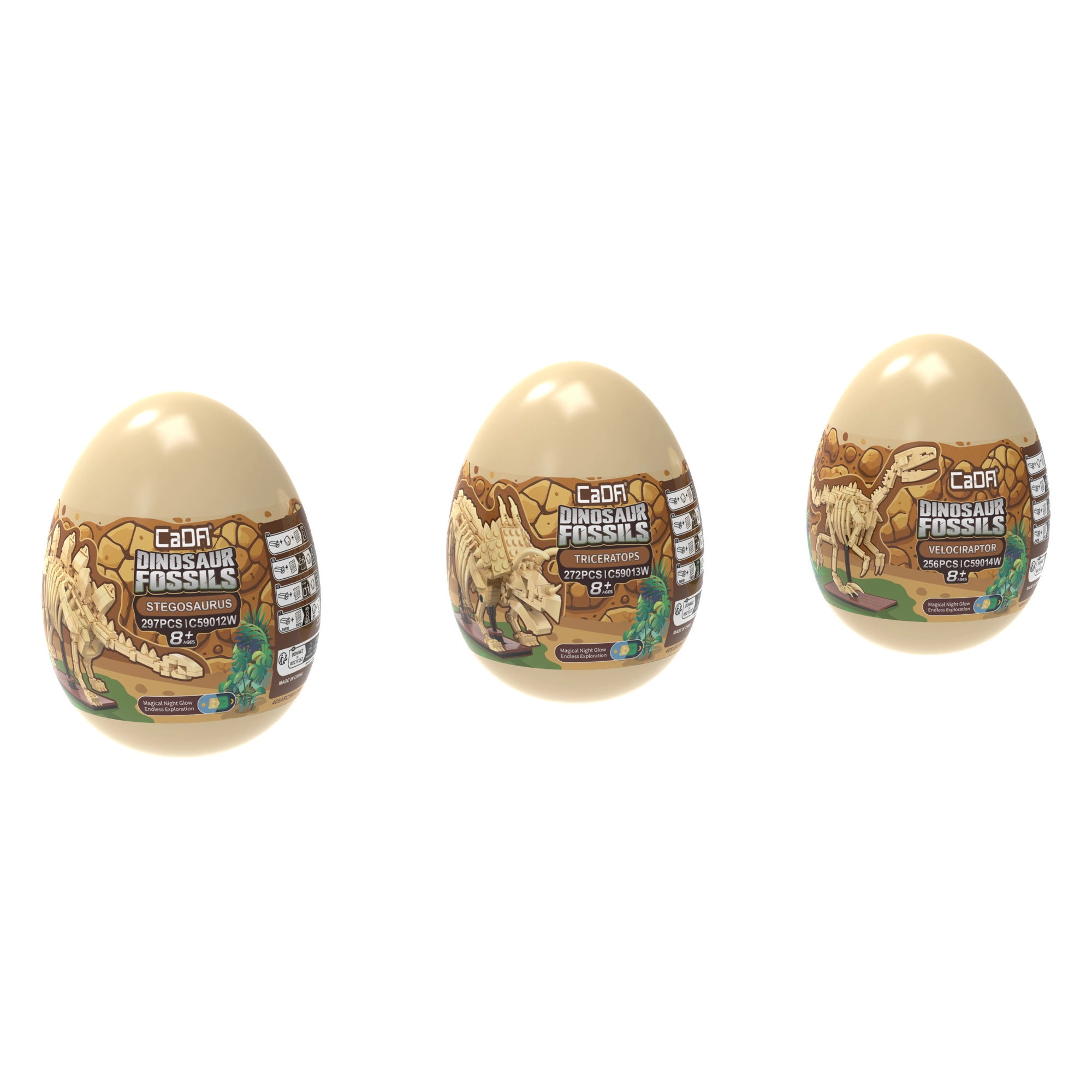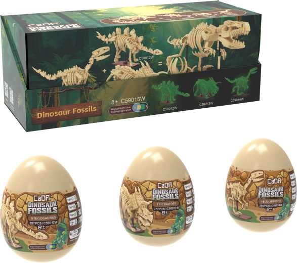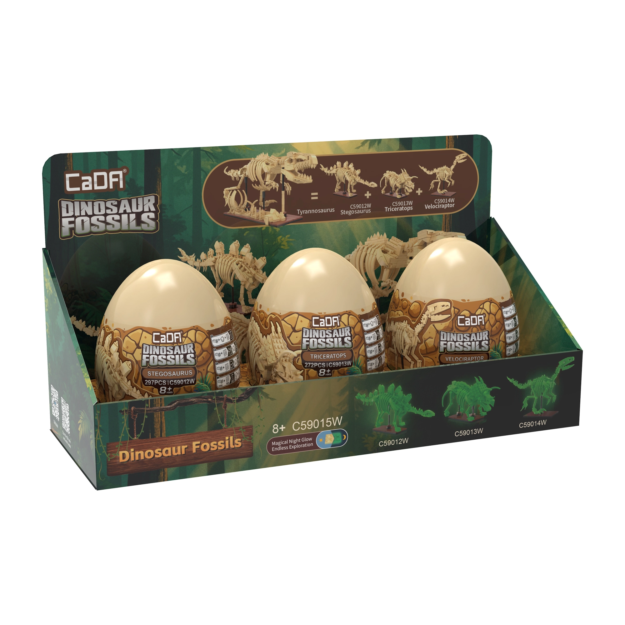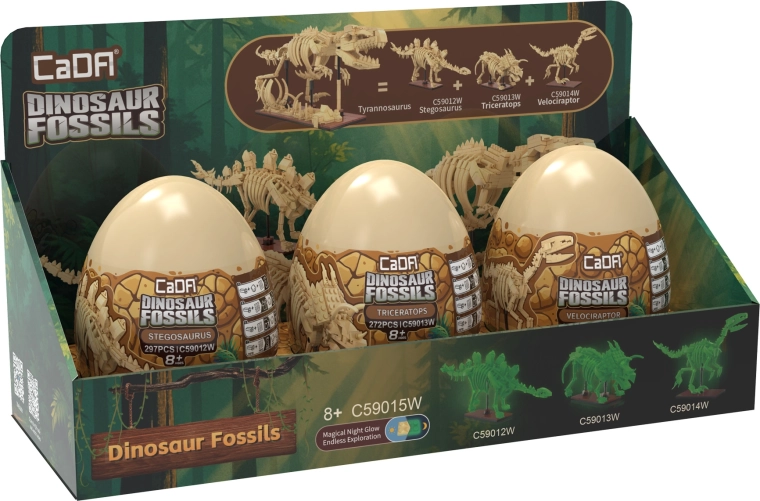Discover the fascinating world of dinosaurs with the CaDA Dinosaur Fossils building set. Build three detailed skeletal models – Triceratops, Stegosaurus and Velociraptor – and then combine them into an imposing TYRANNOSAURUS REX. The parts have a glow-in-the-dark effect, the joints are articulated, and the set includes a total of 825 compatible pieces packed in practical collectible “eggs”.