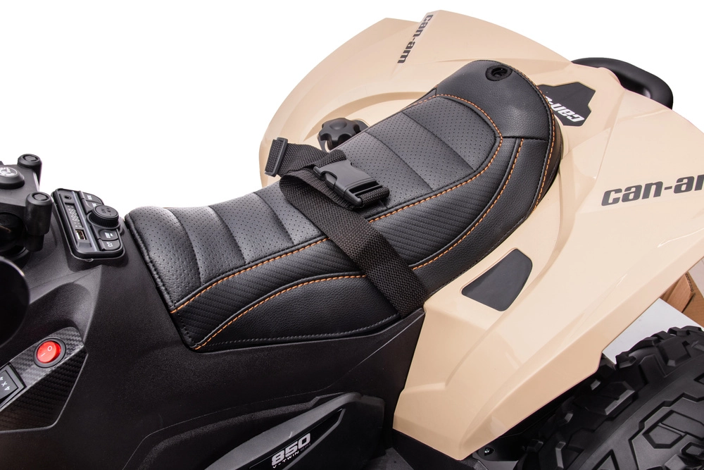 A stylish kids' electric quad inspired by the CAN-AM ATV in khaki offers tons of fun in the yard or park. Thanks to the rugged off-road wheels, 4x4-look drivetrain, comfortable seat, and working LED lights, it looks realistic and is ready for everyday adventures.