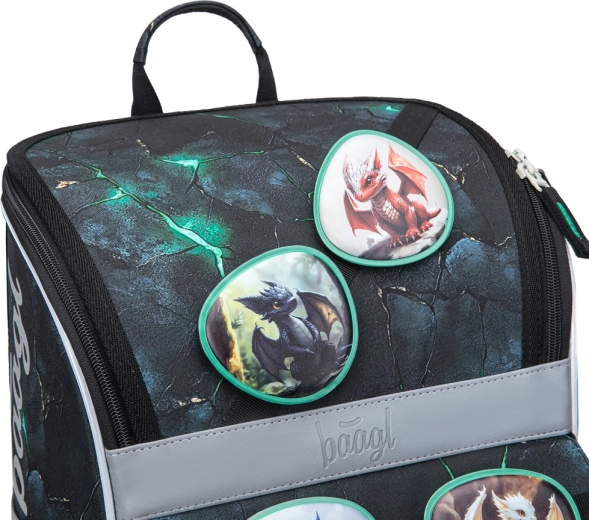 Complete school set for first graders and younger pupils with a dragon motif: an ergonomic BAAGL Zippy school bag with an adjustable back system, a spacious pencil case, and a lightweight sports drawstring bag. It offers reflective safety elements, quality YKK zippers, durable and water-resistant materials, and smart organization for neatly storing supplies and sports gear.