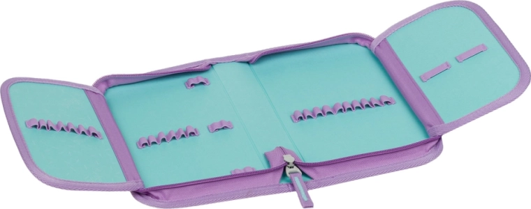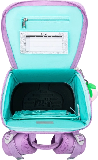 The BAAGL Zippy Lavender school set combines practical craftsmanship with an eye-catching iridescent glossy design. The ergonomic satchel with the ERGO ADJUSTABLE sliding back system adapts to the child’s build, while the flip-up lid and thoughtful organization make it easy to access textbooks and supplies right from the desk. The set is complemented by a two-flap pencil case with a sturdy YKK zipper and a washable drawstring bag for shoes or sports gear.