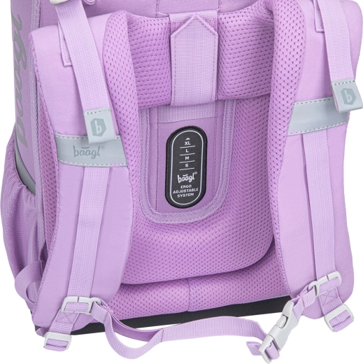 The stylish BAAGL Zippy Lavender school set for primary school includes an ergonomic satchel, a spacious pencil case, and a PE drawstring bag. It offers a lightweight construction, a height-adjustable back system, high-visibility reflective elements, and durable materials with a water-repellent finish. An ideal choice for comfort, organization, and safety every school day.