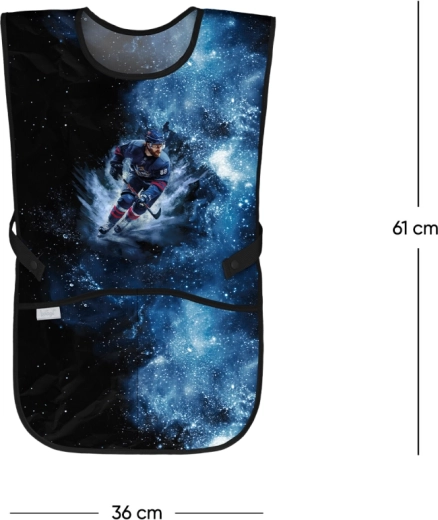 Practical children's apron with a hockey motif for art class, handiwork, and various clubs. It features an wipe-clean material for easy maintenance and two spacious pockets for small tools.