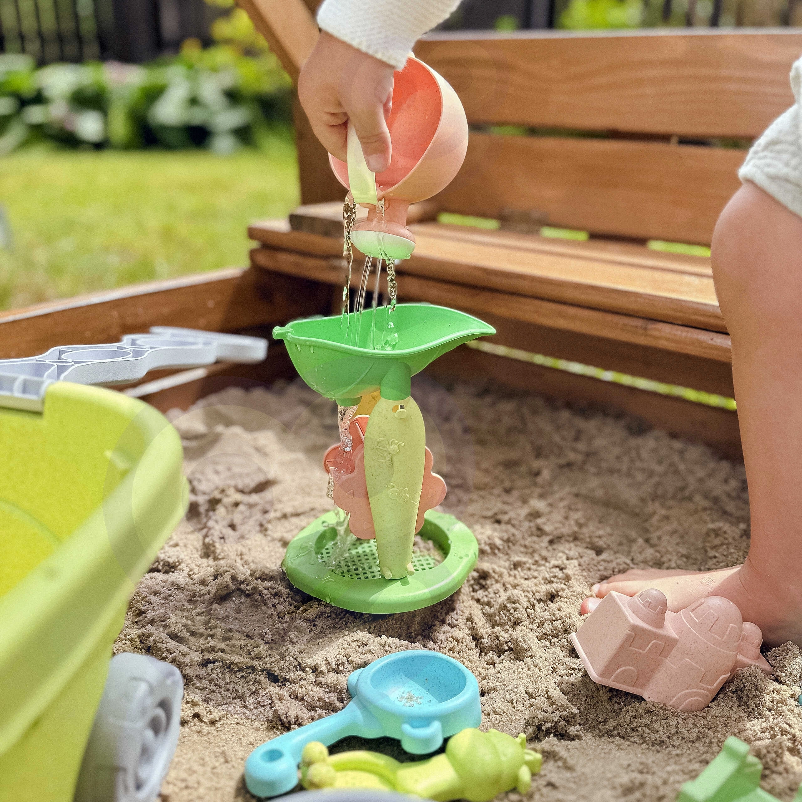Pour sand or water into the funnel and watch the wheels spin. The integrated sieve helps clean the sand and adds a fun element of experimentation.