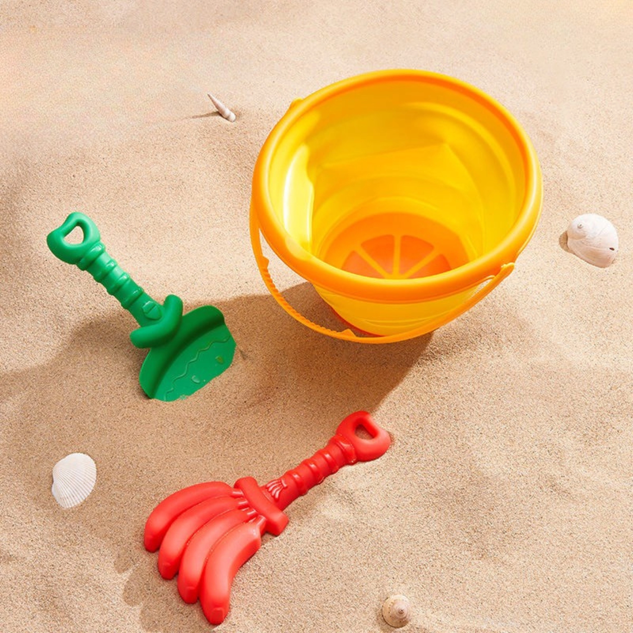 - 2 molds (raspberry, strawberry), shovel (strawberry), rake (bananas), foldable bucket (orange)