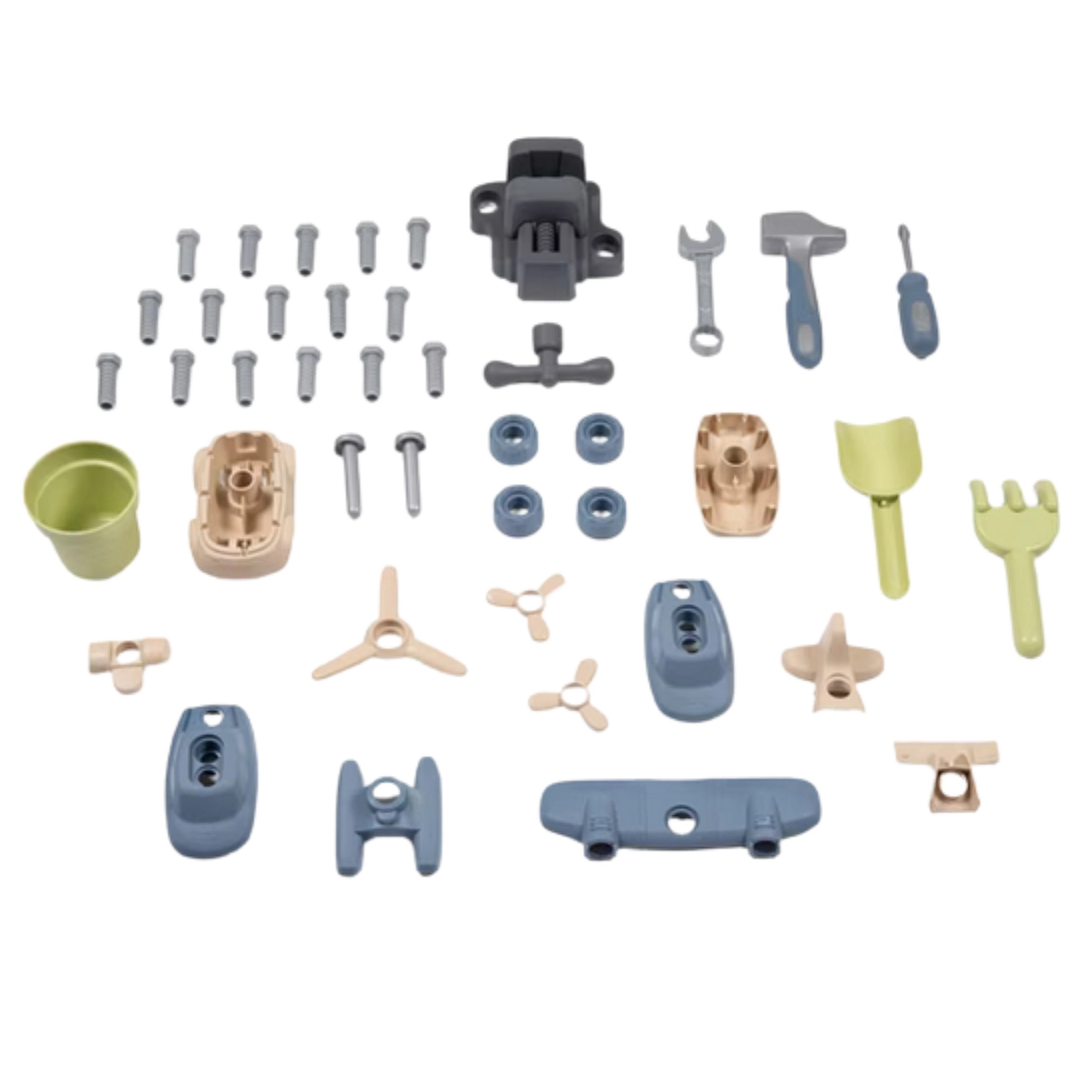 Included is a rich set of tools and fasteners (hammer, screwdriver, wrenches, screws, nuts, and more) that develop hand–eye coordination, logical thinking, and dexterity. Two windows with adjustable louvers and partially opening doors provide great ventilation and a realistic play experience.