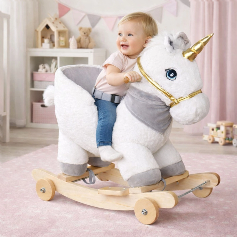 A cute white 2‑in‑1 unicorn that combines a rocking plush buddy and a ride-on with wheels in one safe toy for little ones. It features soft plush padding, a high backrest, sturdy handles, and stable wooden rockers. Integrated neighing and galloping sound effects spark imagination and the joy of movement.