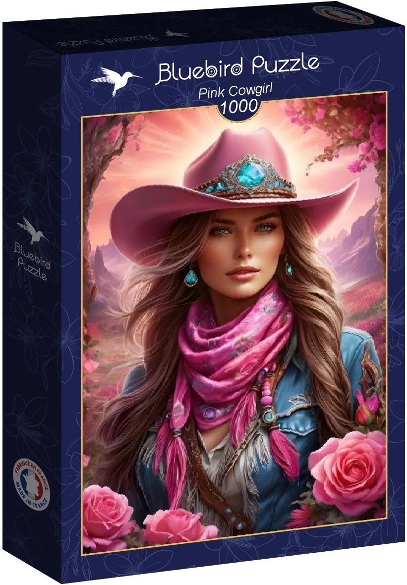 Enjoy relaxing with a quality BLUEBIRD puzzle featuring the Pink Cowgirl motif. The box contains 1000 pieces, and once completed it forms an image measuring approximately 47.8 × 69 cm – an ideal size for framing and display.