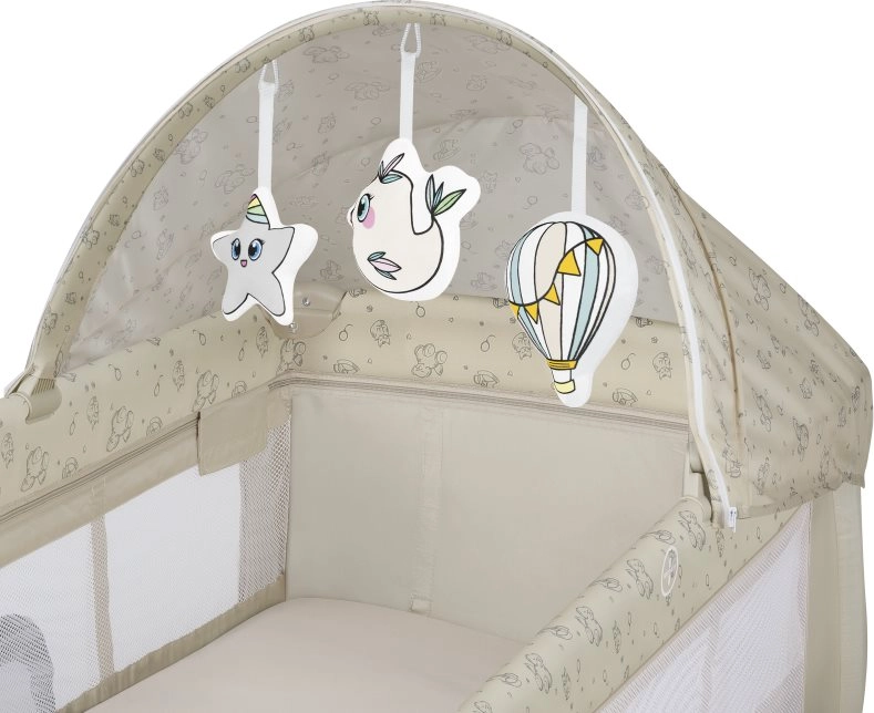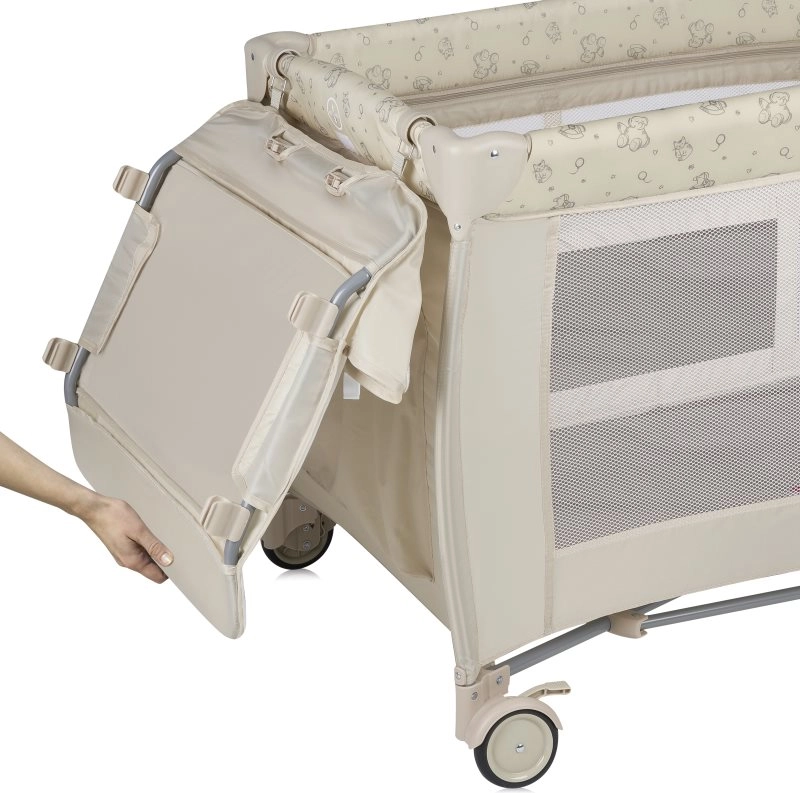 A practical and safe travel cot for babies and toddlers with rich accessories for comfort at home and on the go. It offers two mattress height levels, a mosquito net, a changing table, lockable wheels, and a side zip entry. Thanks to its stable construction, the LockGuard system preventing accidental folding, and breathable mesh sides, it provides a safe environment for sleep and play.