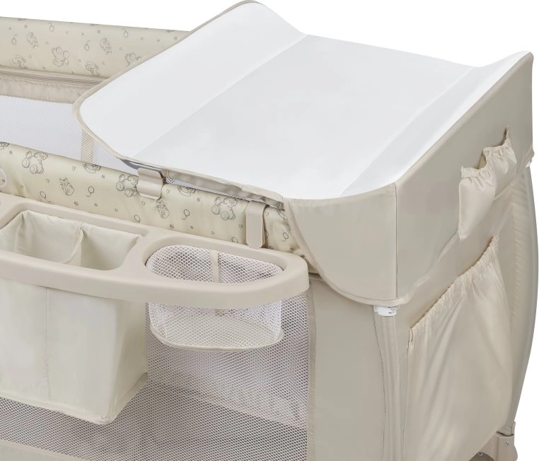 An integrated changing table and a side panel with 3 pockets keep diapers, wipes, and essentials neatly at hand — for quick changes anytime, anywhere.