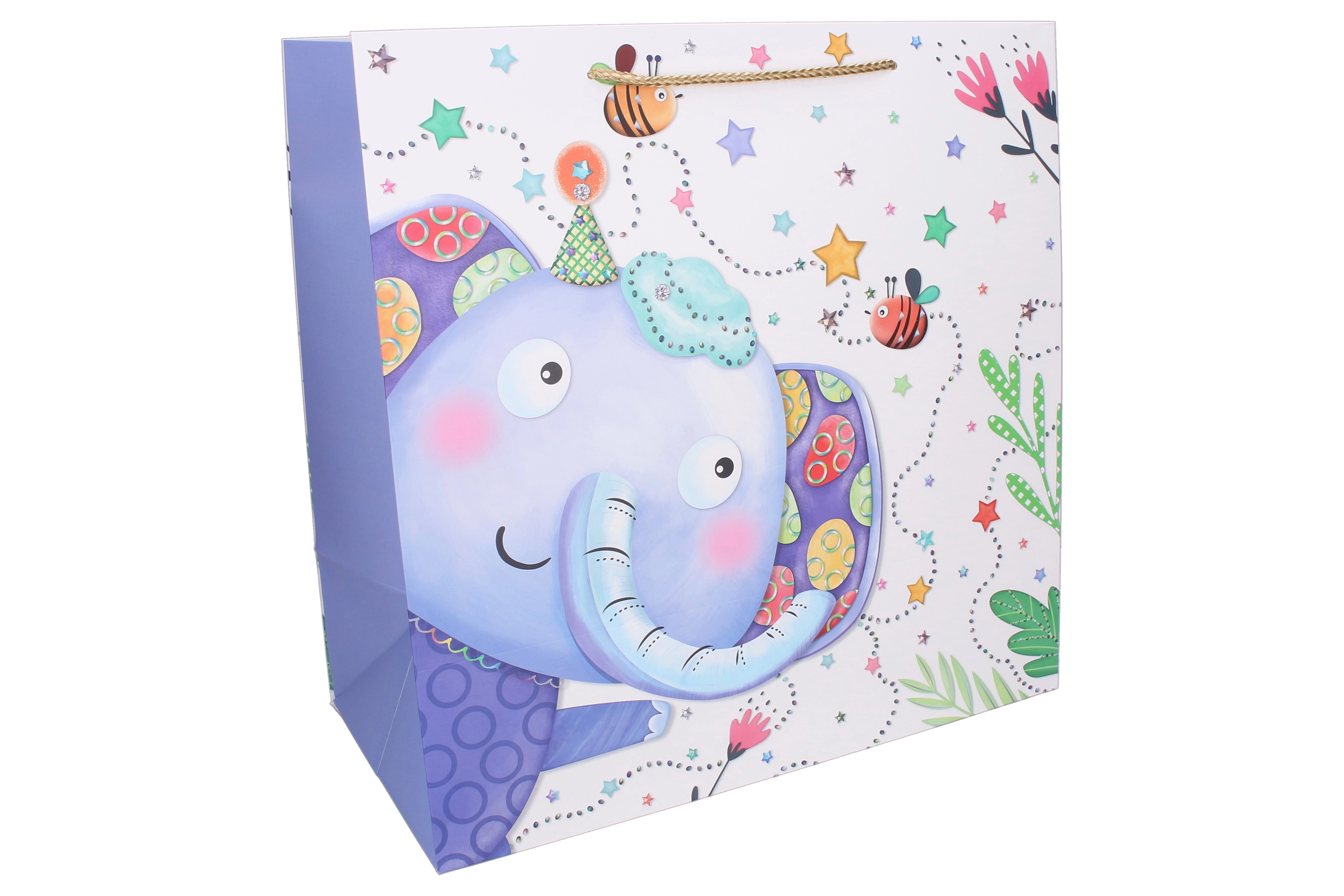 This spacious gift bag with kids' motifs is a perfect choice for packing larger surprises. Quality paper, vibrant print, and sturdy cord handles ensure easy and safe carrying. The cute animals and playful illustrations give every gift a joyful look.
