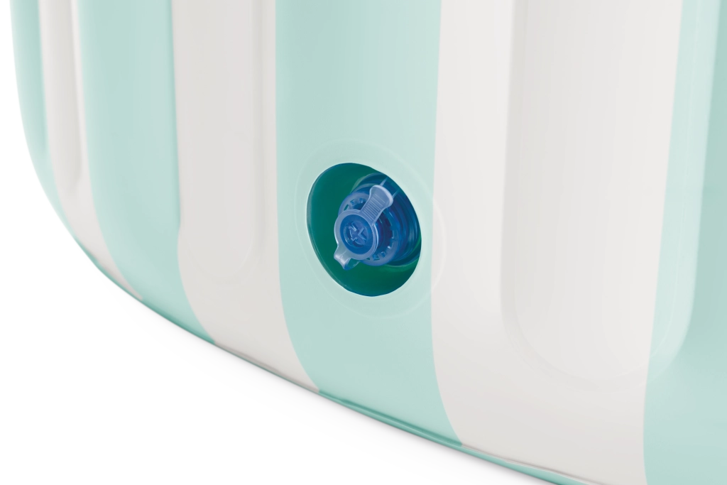 The stylish Coastal Luxe inflatable children's pool with subtle stripes in turquoise and white offers safe refreshment for kids aged 3 and up. Thanks to its sturdy, comfortable construction made from durable PVC, it’s stable and pleasant to the touch. Its compact dimensions suit both garden and balcony, and a practical drain valve makes maintenance easy.