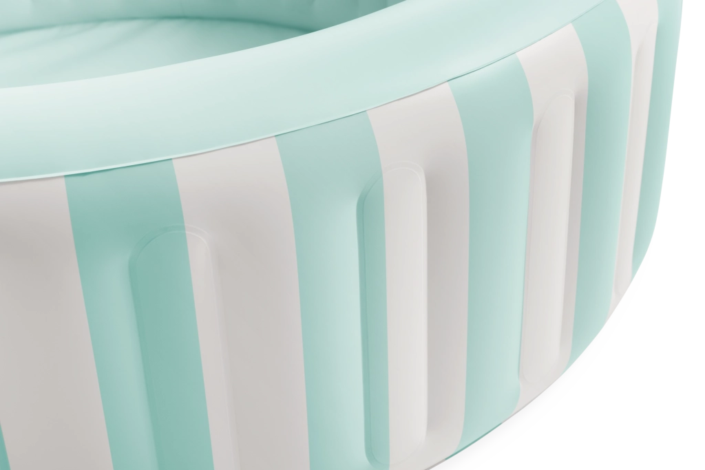 The Coastal Luxe inflatable pool, featuring a modern coastal design, is ideal for summer water play for younger children. Vertical stripes in light turquoise and white feel fresh, while the smooth inner surface in a soft turquoise shade evokes a sense of cleanliness and calm. Durable PVC and multi-chamber walls offer stability and comfort for sitting and playing.