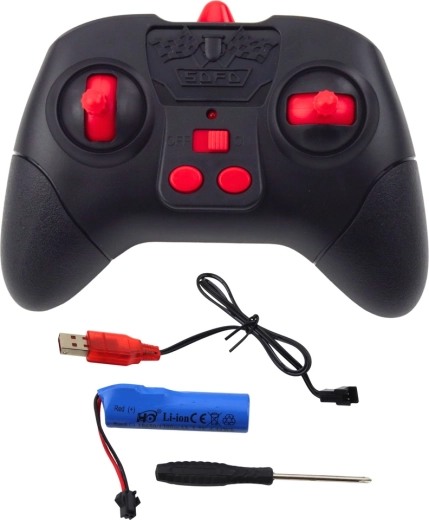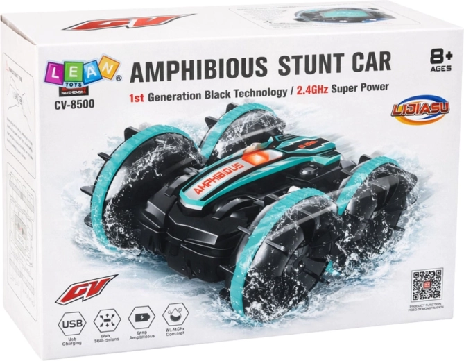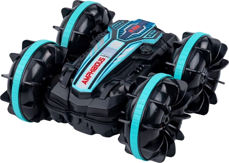 - Amphibious RC car, 2.4 GHz controller, gesture-control wristband, 6 V 400 mAh battery, USB charging cable