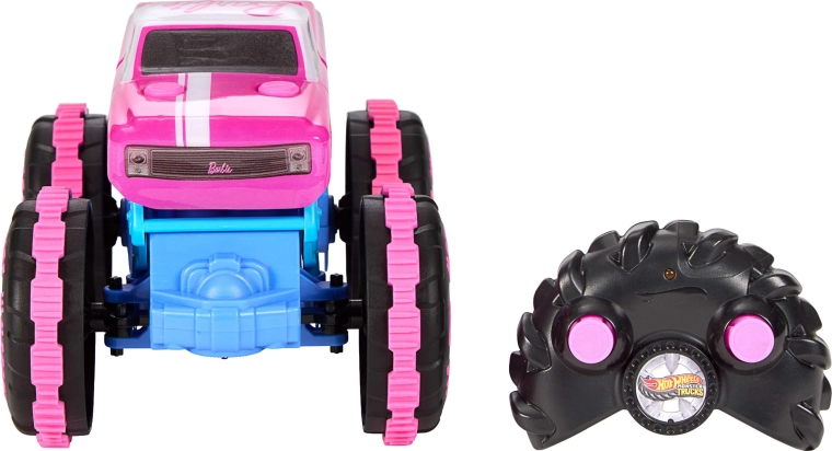 Pink-blue RC Monster Truck HOT WHEELS BARBIE 1:24 delivers fun on any surface. Thanks to the large off-road tires, stable construction, and precise 2.4 GHz control, it handles driving, stunts, and wheelies. Ideal for kids from 4 years, it develops coordination and creativity.