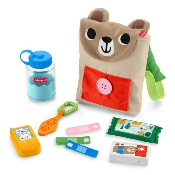 This playful set from Fisher‑Price turns every outing into an adventure. The soft bear backpack with a buttoned pocket, clip, and loops hides clever accessories: a “water bottle,” kids’ “walkie‑talkie/phone,” fabric bandages with hook-and-loop, a snack, and more elements that invite pressing, opening, and fastening. Kids practice hand‑eye coordination, grip, and dexterity while role‑playing camping and care.