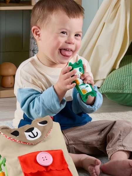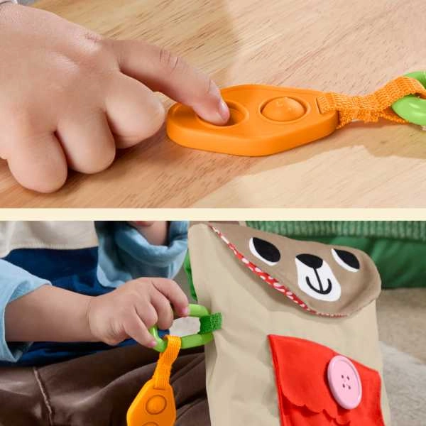 Press the clip, fasten the pocket, bend the “crunchy” snack, and stick on the fabric bandages with hook-and-loop — each activity boosts coordination and dexterity.