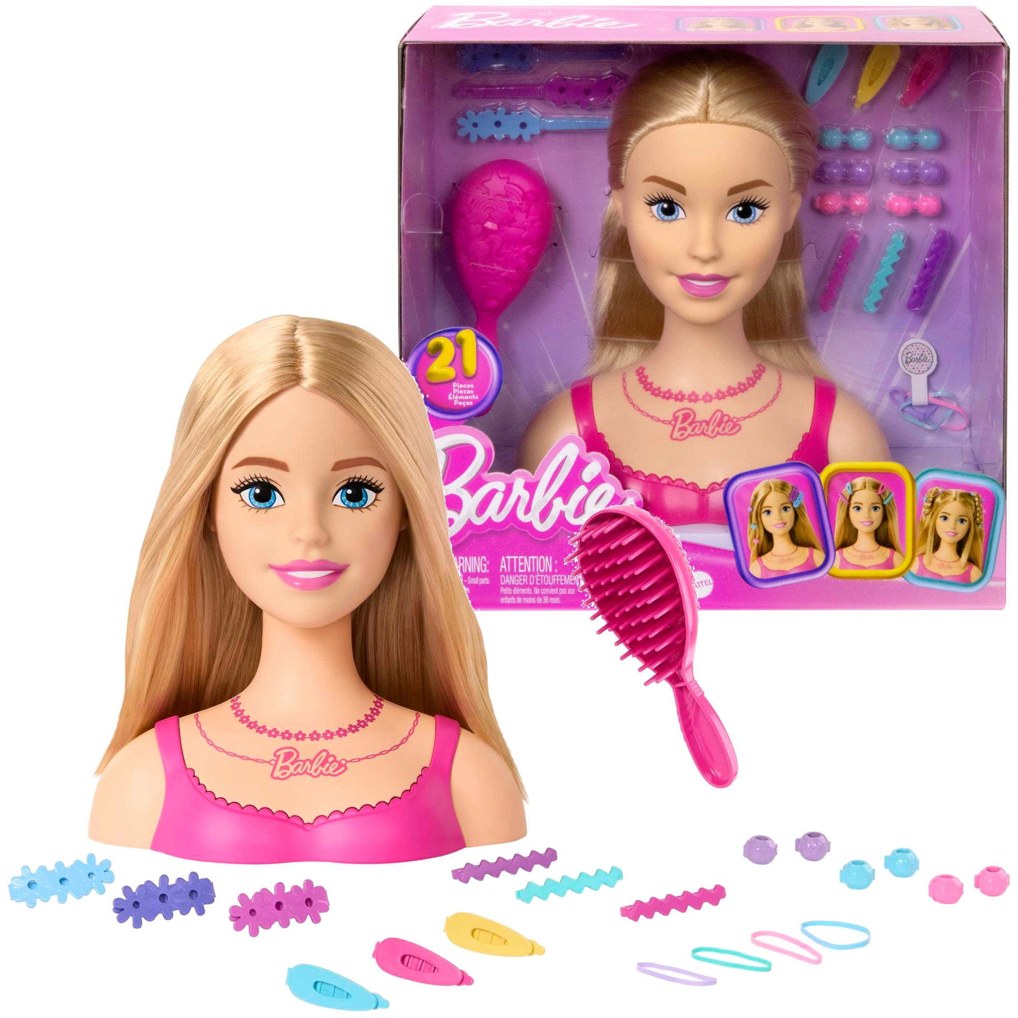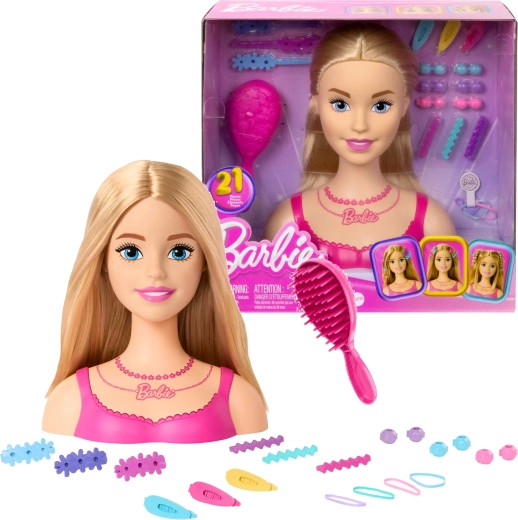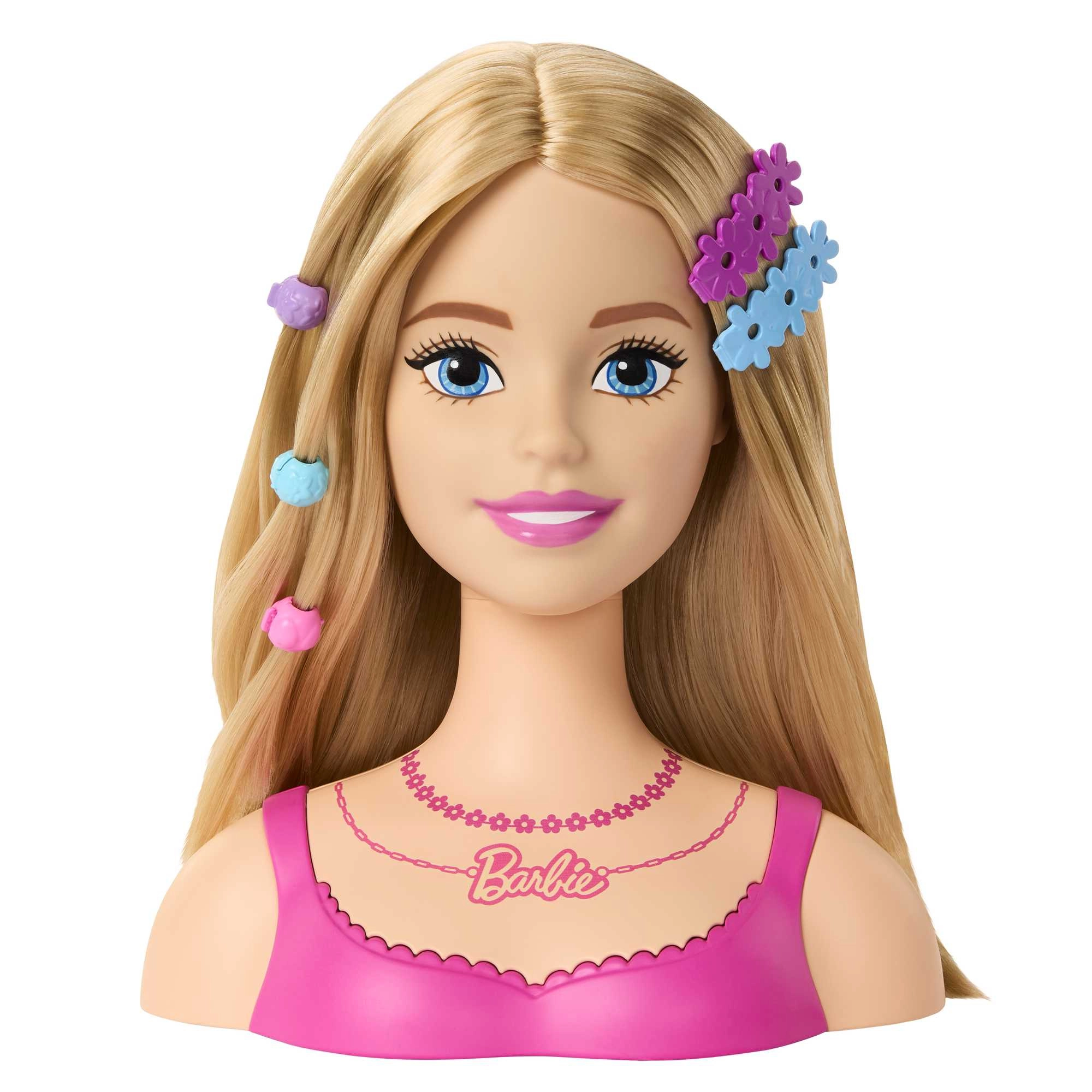 An elegant bust with a pink top and BARBIE necklace looks realistic and invites creative play for little hairdressers.