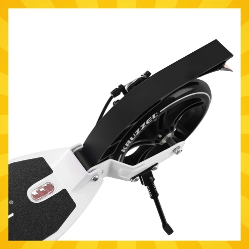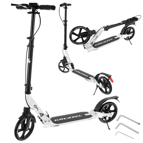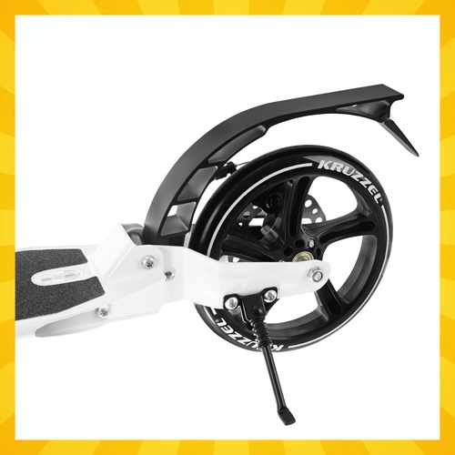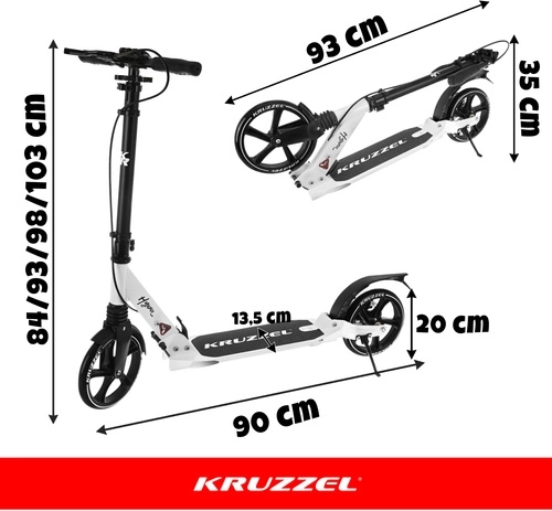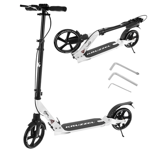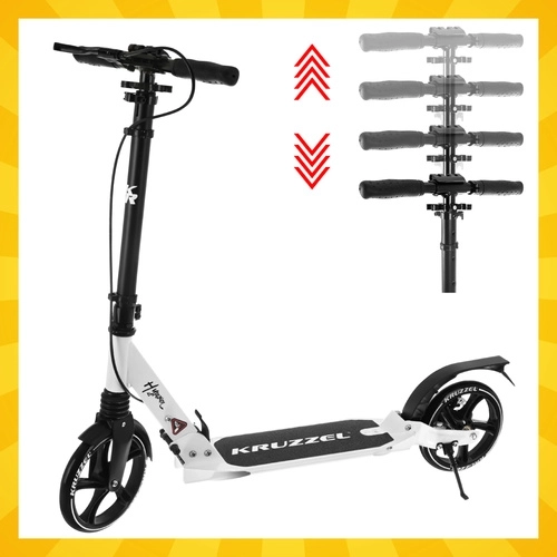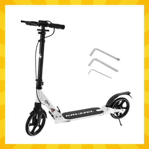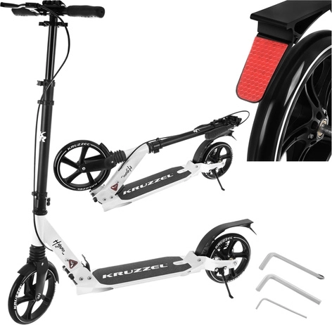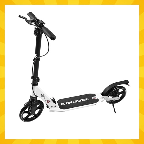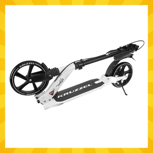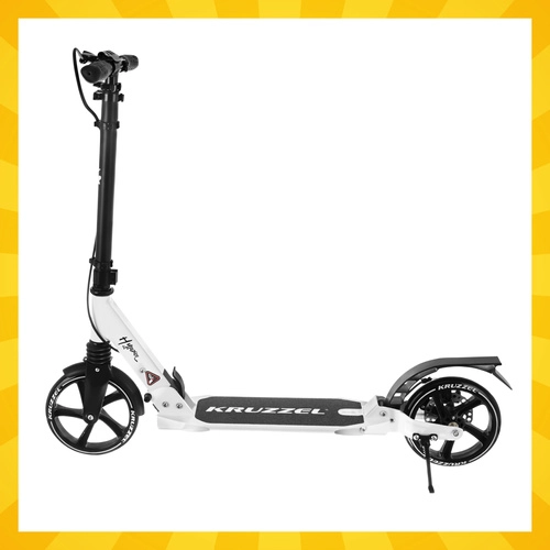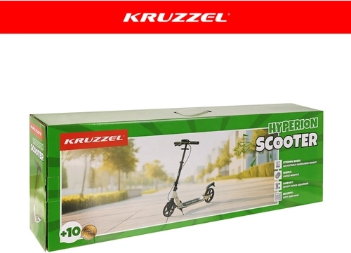 The premium folding scooter KRUZZEL Hyperion for kids and adults offers large 200 mm rubber wheels, ABEC-9 bearings, dual braking (hand and foot), and a lightweight aluminum frame. Thanks to quick folding, suspension, and height-adjustable handlebars, it’s ideal for comfortable and safe commuting on sidewalks and bike paths.