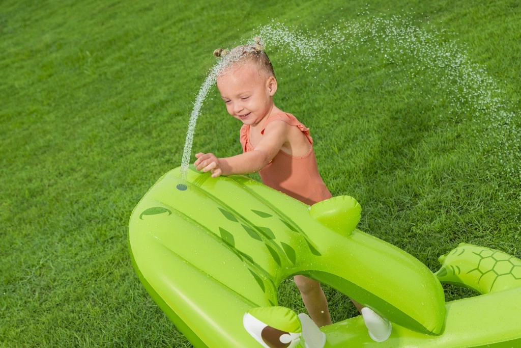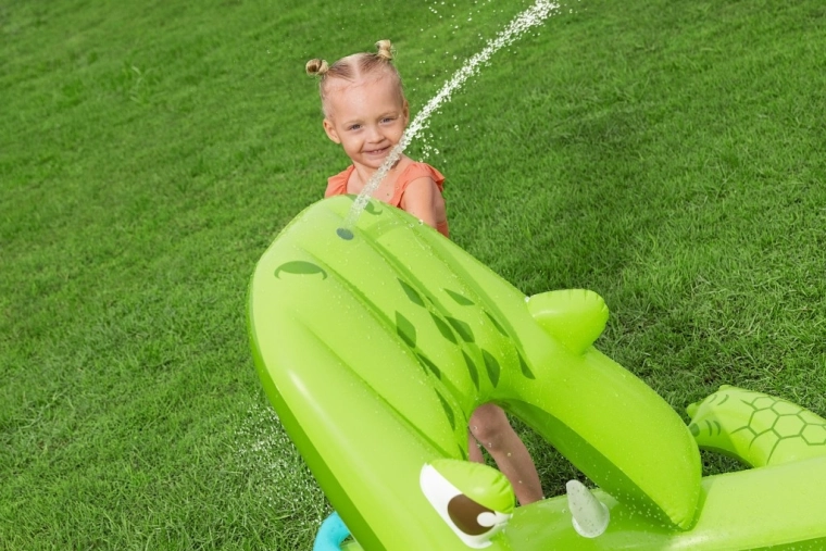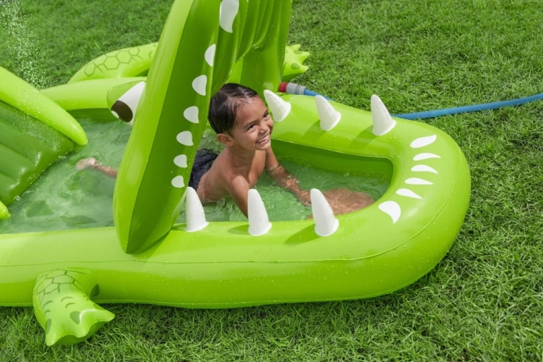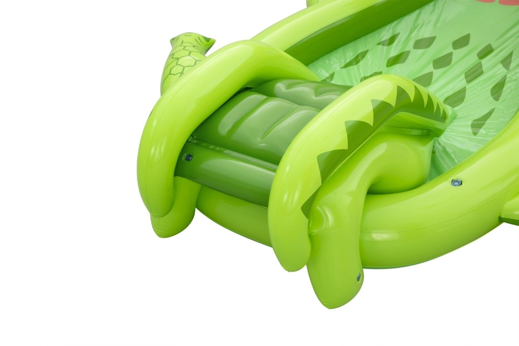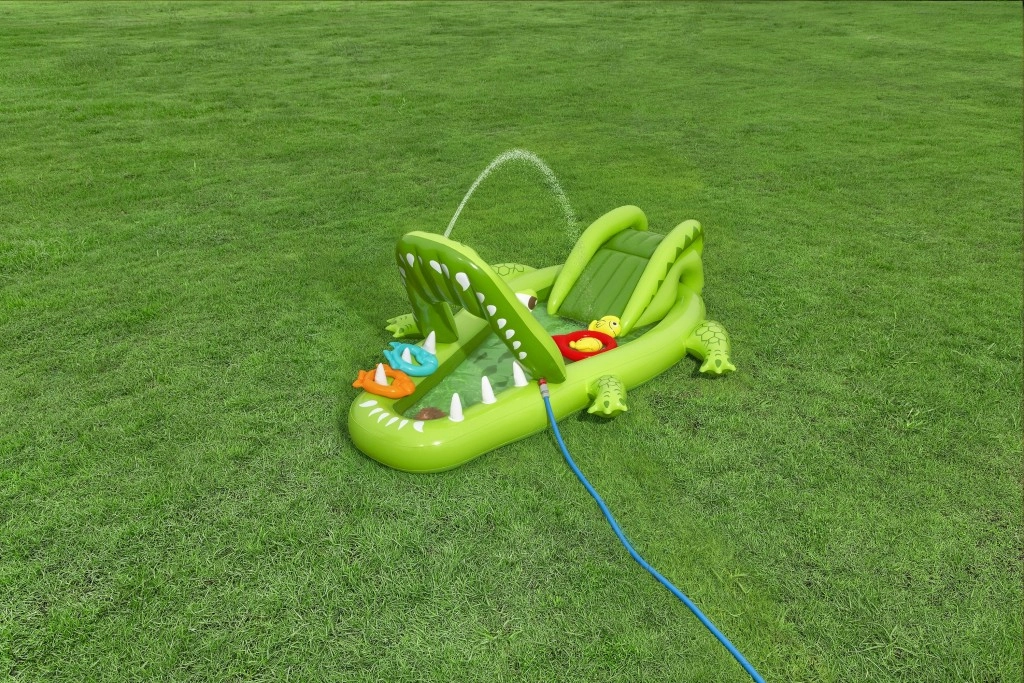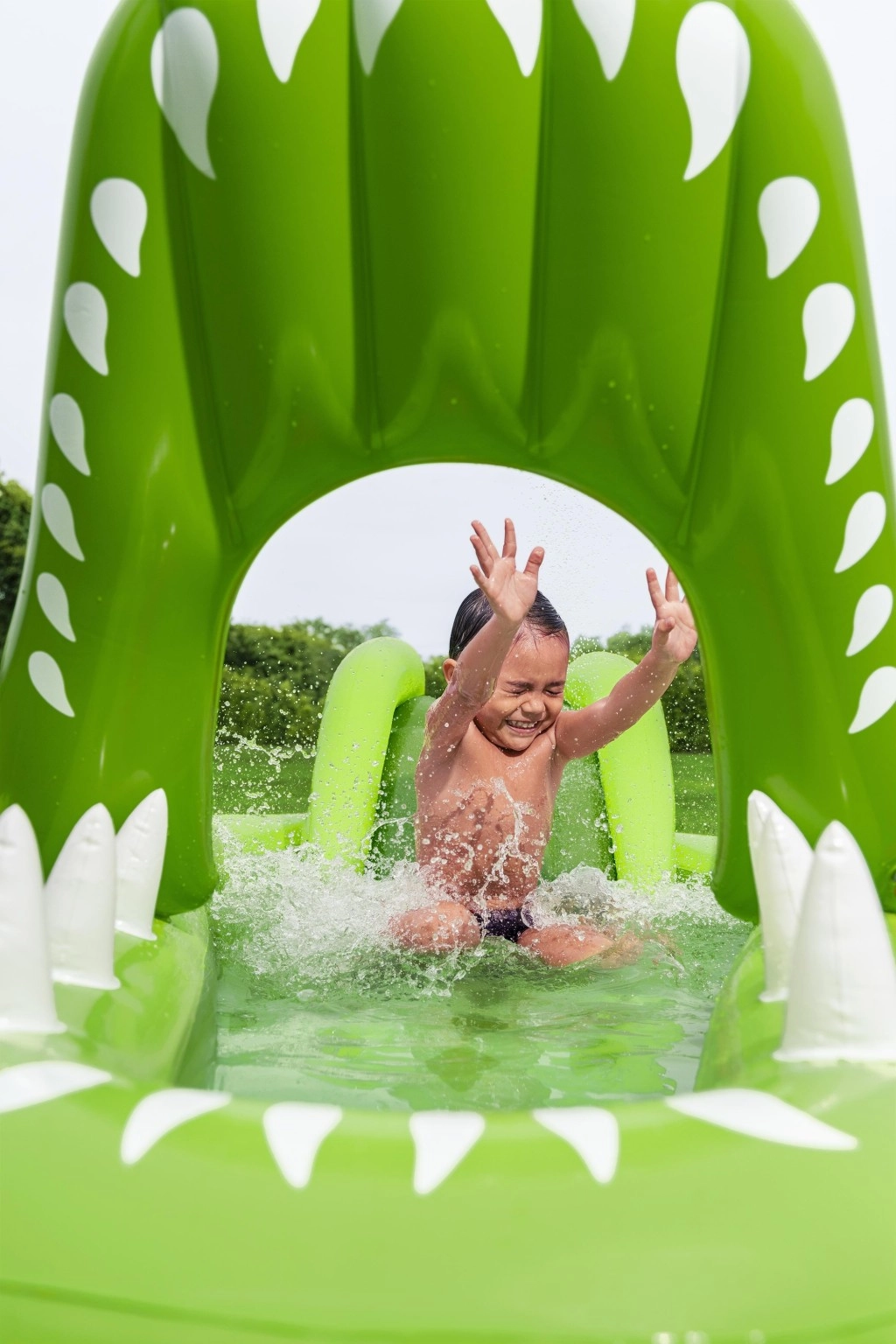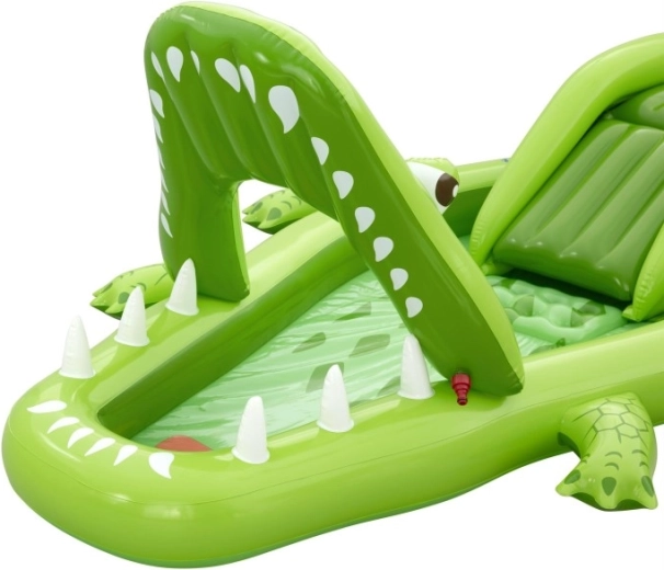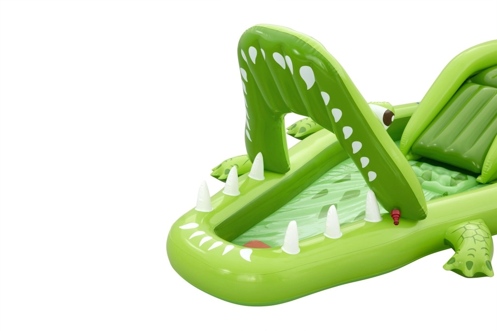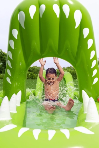 This inflatable alligator play center brings hours of active backyard fun. The realistic design with a “mouth–gate” encourages play, crawling, and sliding, while the water sprayer that connects to a garden hose creates a gentle shower over the slide for extra slipperiness and cooling.