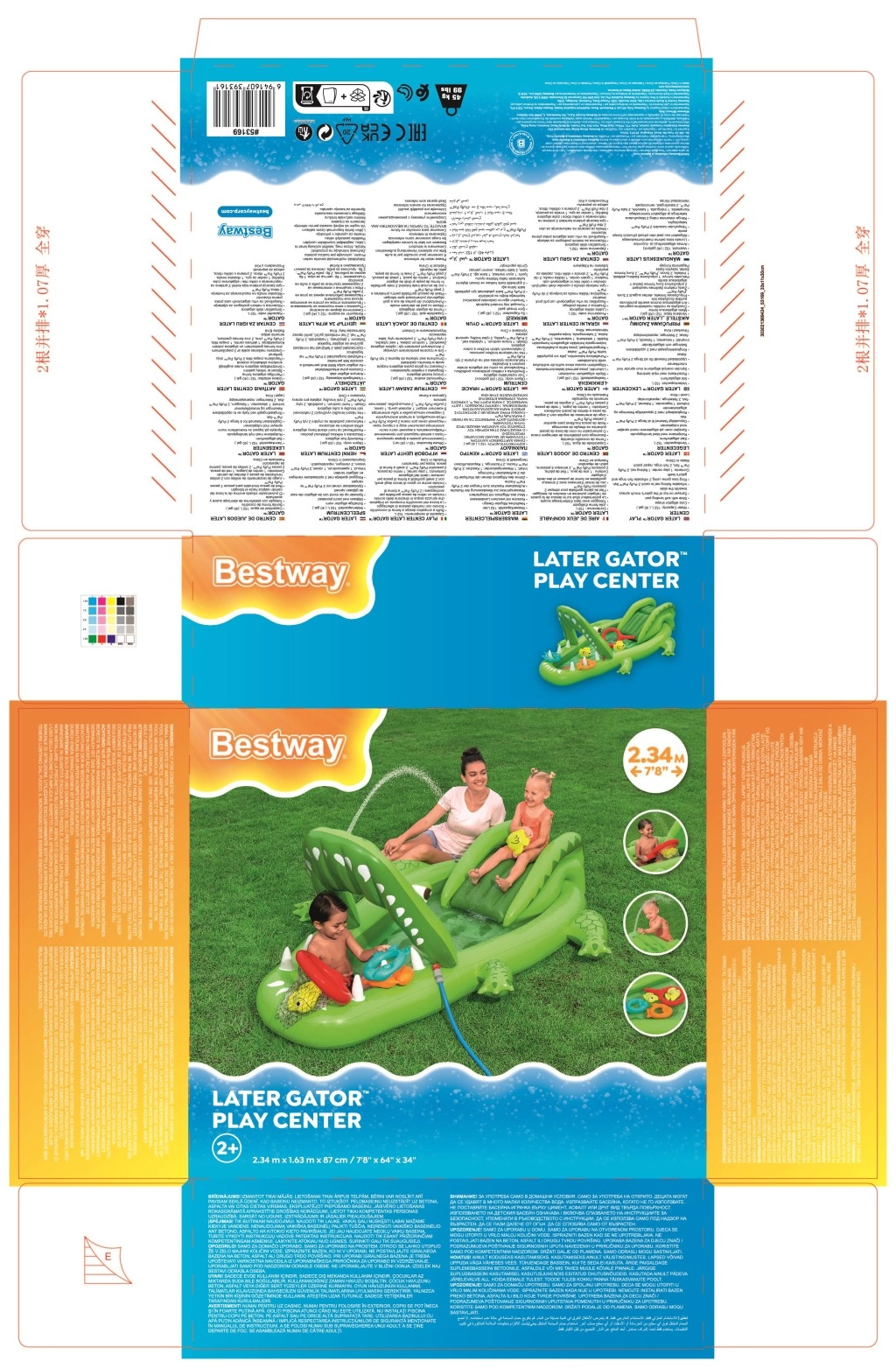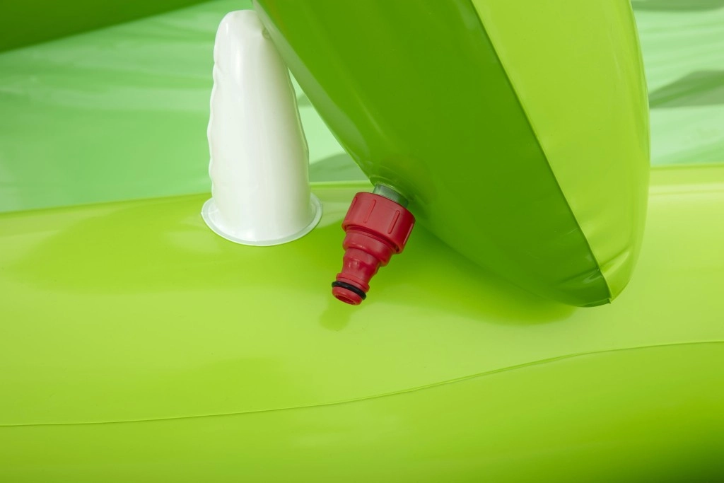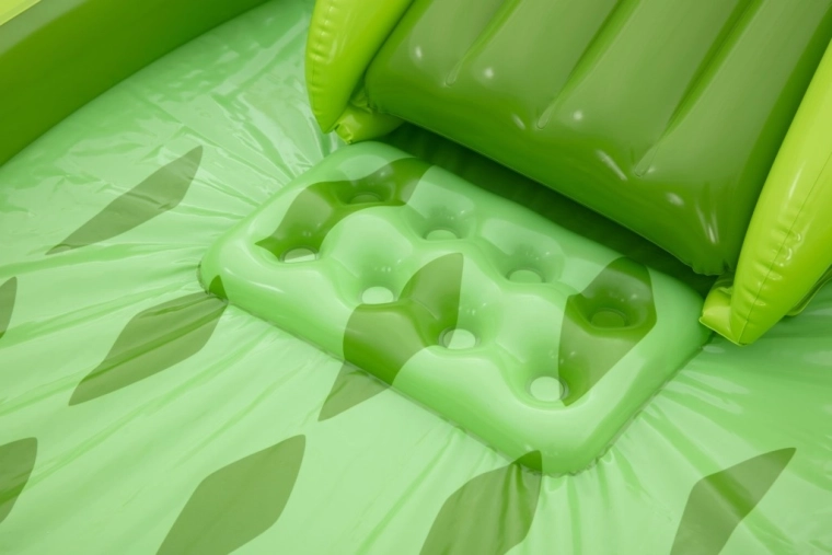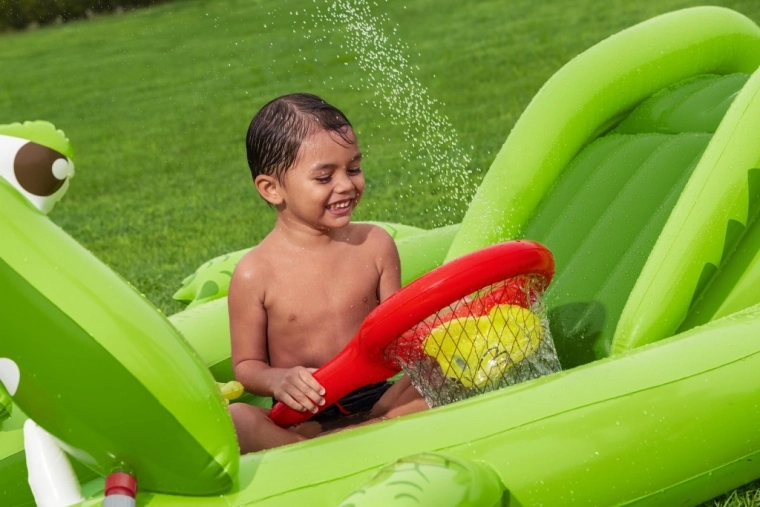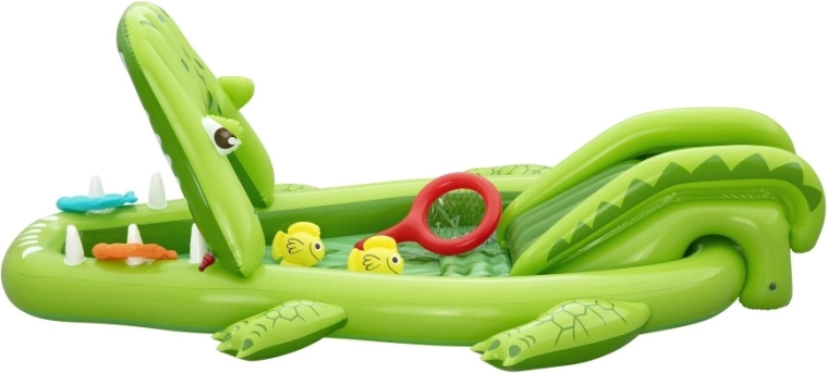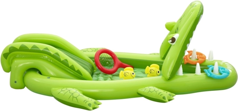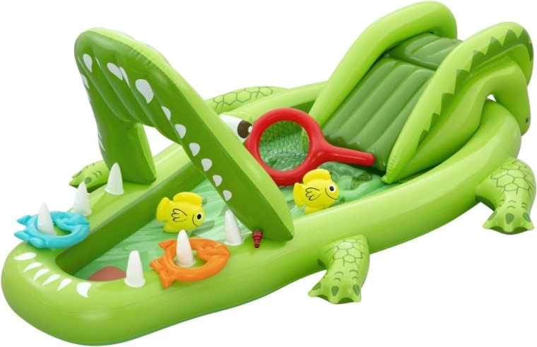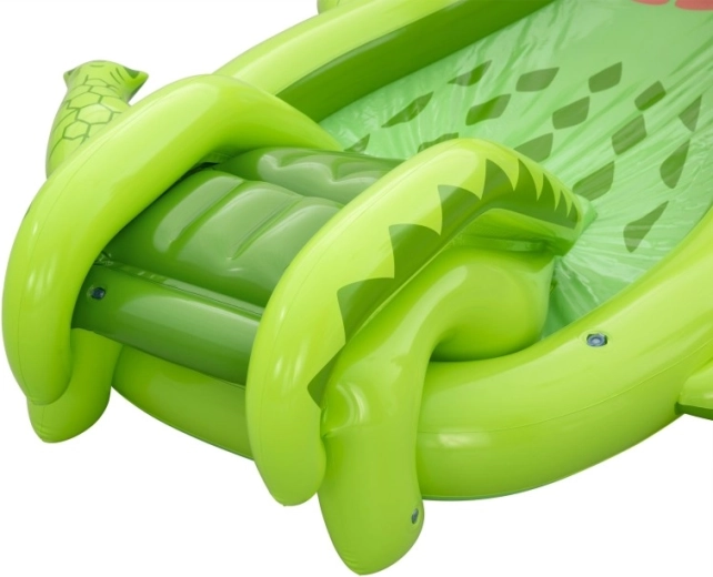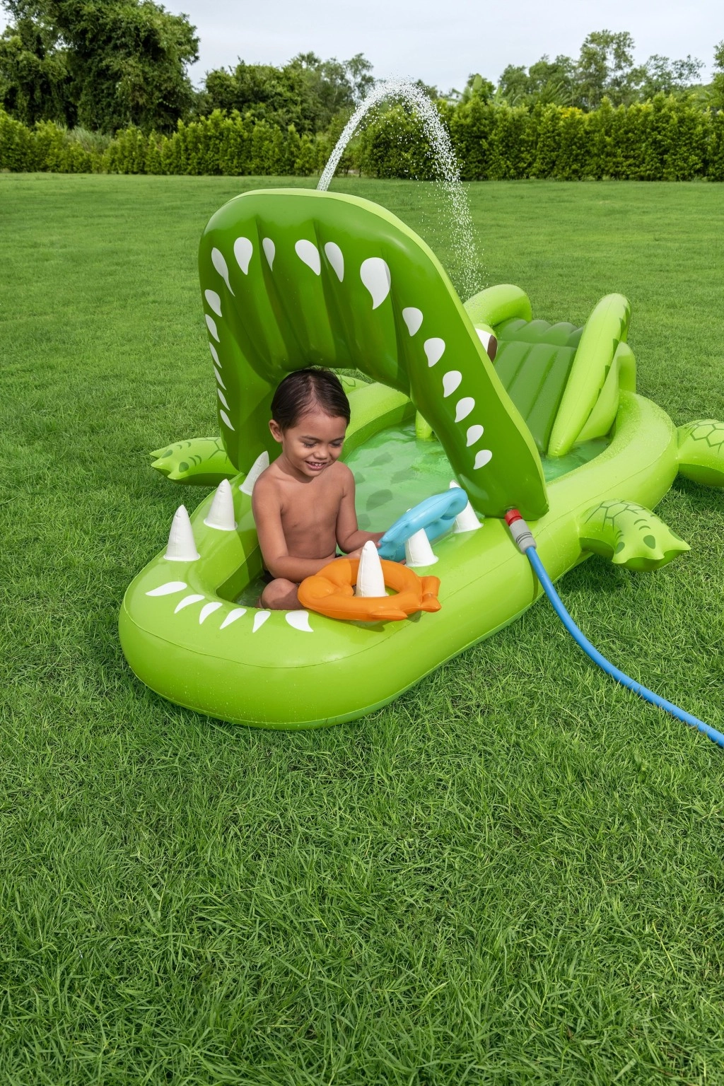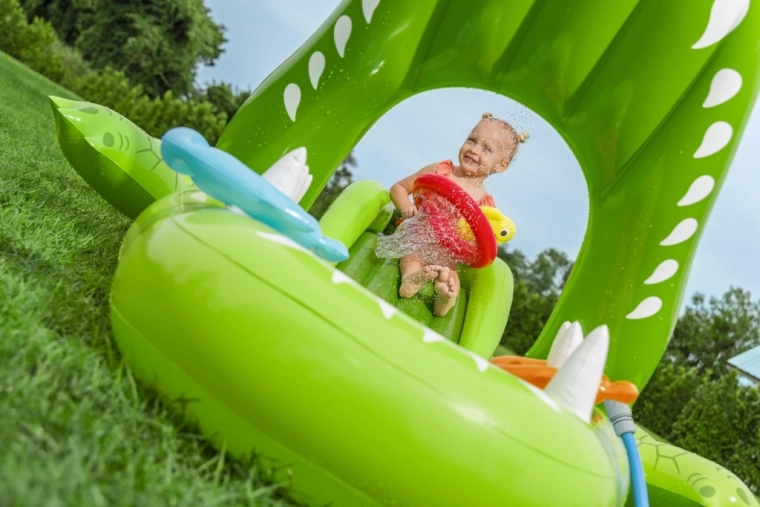 This inflatable alligator play center brings hours of active backyard fun. The realistic design with a “mouth–gate” encourages play, crawling, and sliding, while the water sprayer that connects to a garden hose creates a gentle shower over the slide for extra slipperiness and cooling.