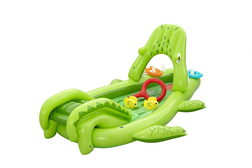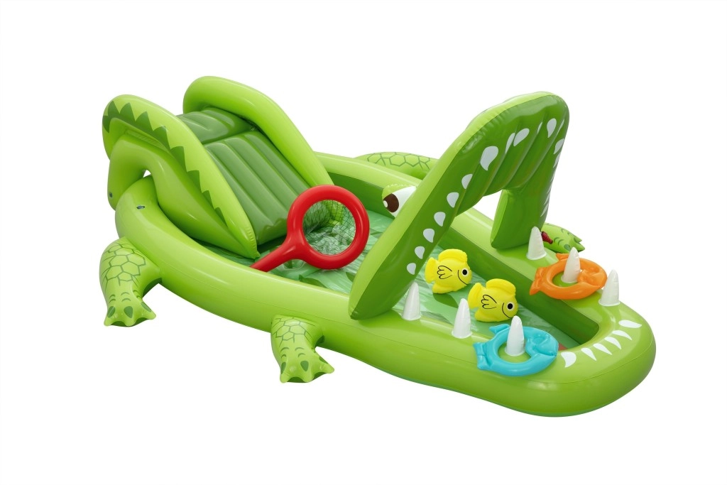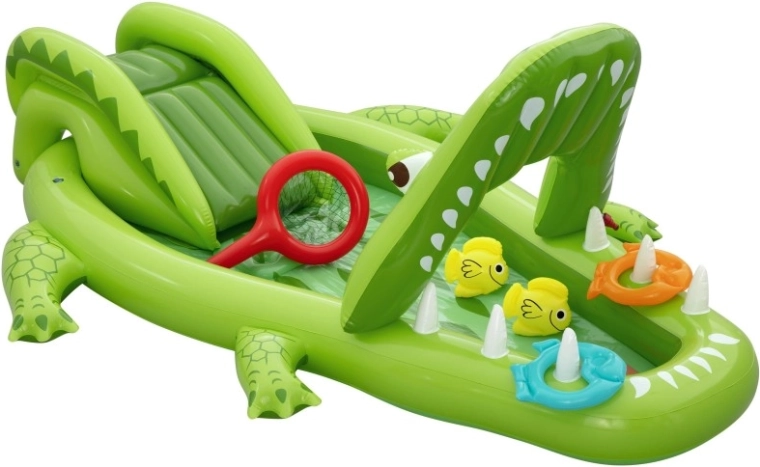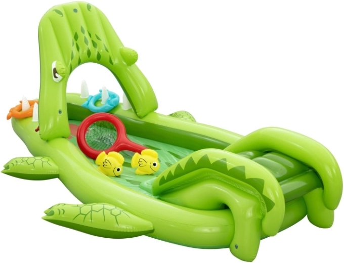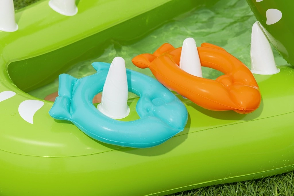 Soft inflatable walls and a padded landing zone under the slide ensure safety and comfort. The package includes skill-game accessories — two fish, two inflatable fish rings, and a landing net — so children can practice coordination, catching, and tossing rings onto the alligator’s “teeth.”