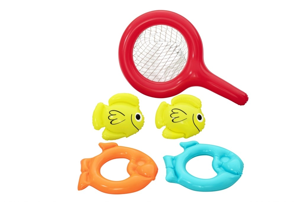 Includes two fish, two inflatable rings, and a landing net. Kids can catch, toss, and aim at targets to build fine motor skills.