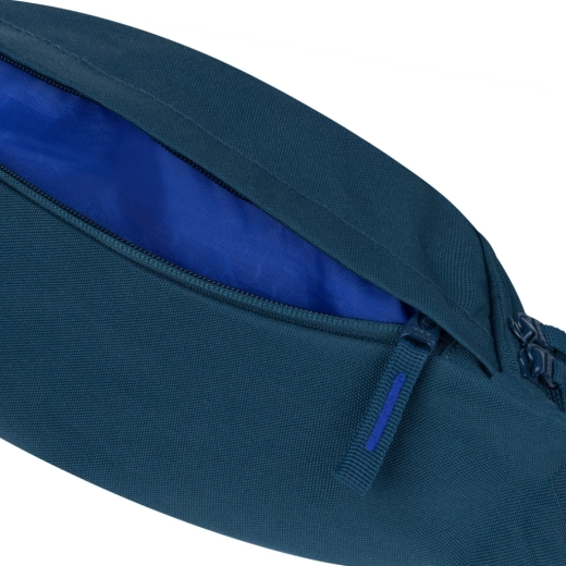 A stylish and practical BAAGL waist bag in blue, ideal for city wear and leisure. It features a water-resistant recycled material, a two-way YKK zipper, adjustable straps on both sides, and a durable MEICO buckle. With a capacity of 4.5 l and a weight of only 100 g, it offers ample space without unnecessary bulk. The Global Recycled Standard (GRS) certification confirms its sustainable origin.