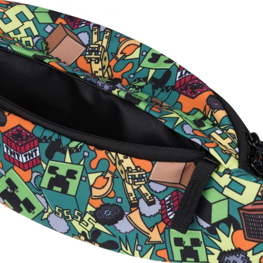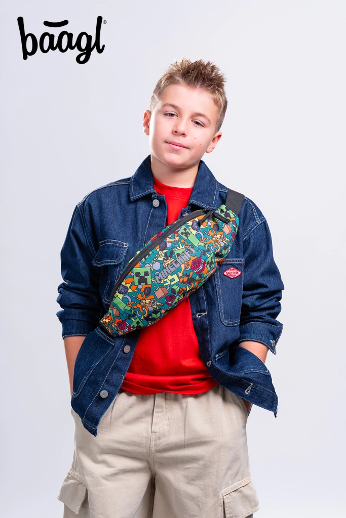 The stylish BAAGL waist bag in the popular MINECRAFT Chaos design is a practical everyday accessory. It features a two-way YKK zipper, dual-sided adjustable straps, and a durable MEICO buckle. It is water-resistant, made from recycled material, and still ultralight—weighing just 100 g with a volume of 4.5 l.