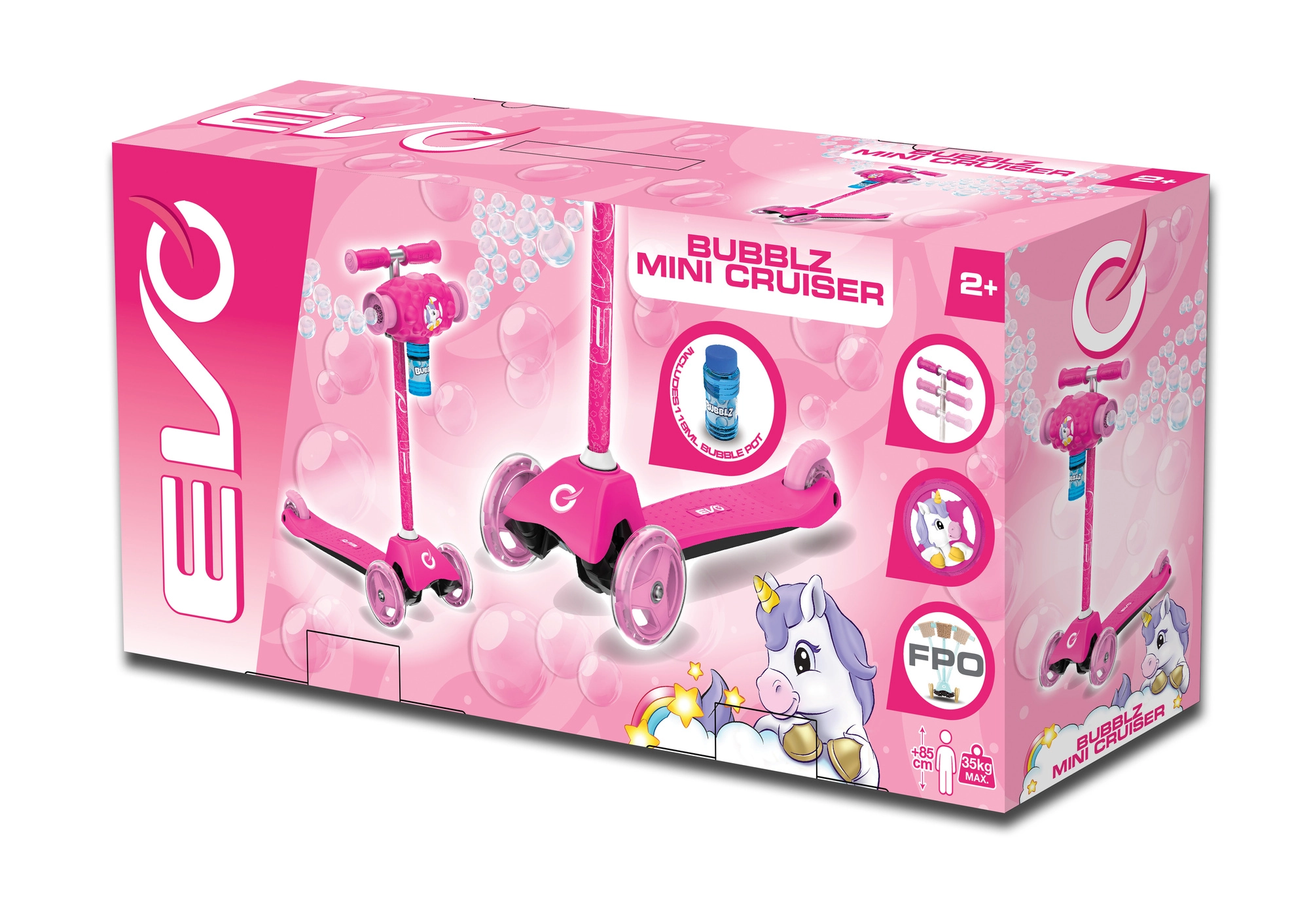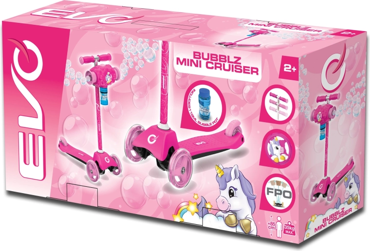 A fun and stable kids’ scooter EVO Bubblz Mini Cruiser with three wheels, lean-to-steer balance control and an adjustable handlebar post. The built-in bubble maker creates plenty of bubbles while riding, which kids will love. The wide anti-slip deck, rear foot brake and ABEC-5 bearings ensure a comfortable and quiet ride. Ideal for children from 3 years and for developing balance and coordination.
