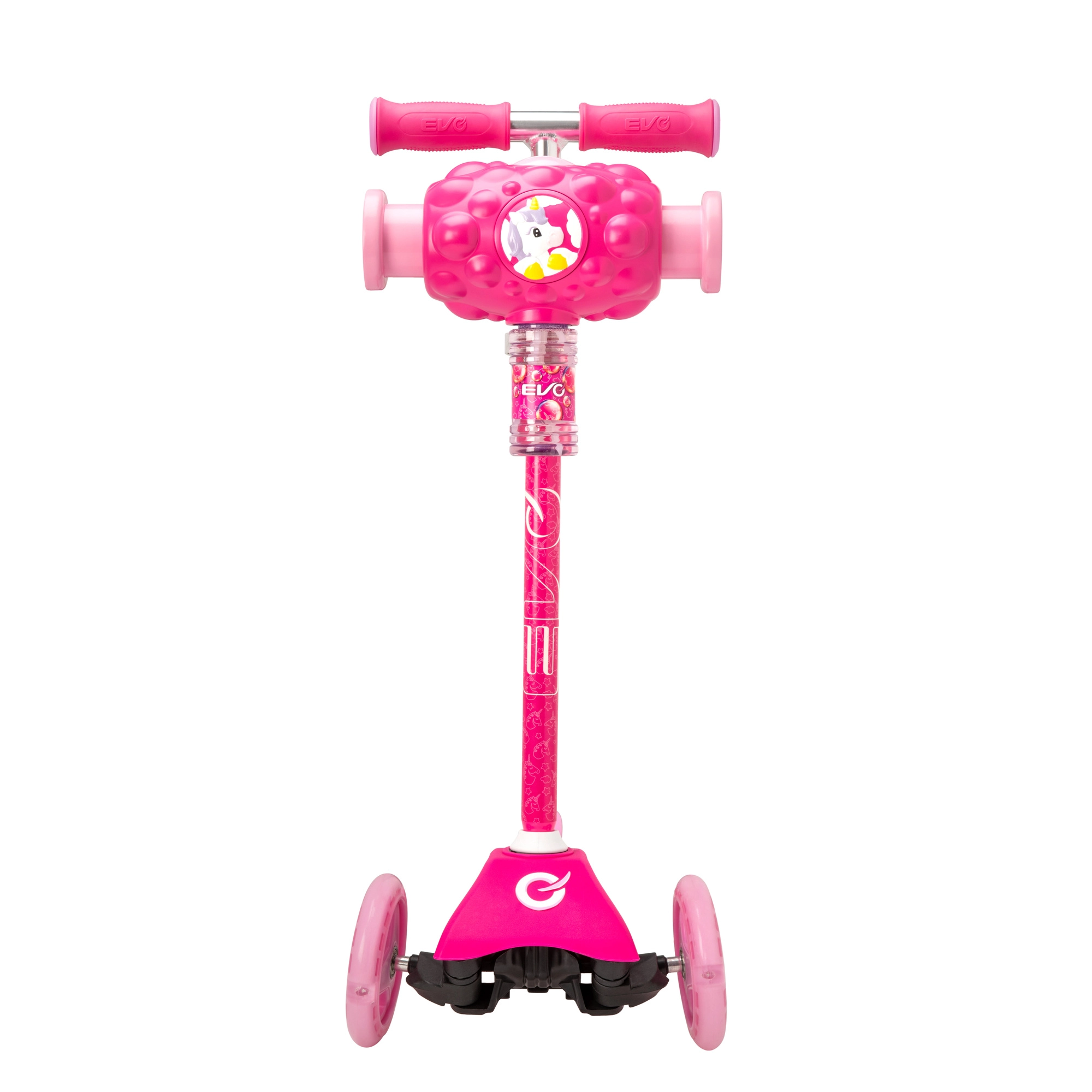 The EVO Bubblz Mini Cruiser is a playful and safe three-wheel scooter for young riders. With two front wheels and one rear wheel, it offers excellent stability, while lean-to-steer control helps kids naturally train balance and coordination. The adjustable handlebar height lets the scooter fit your child’s size, so it grows along with them.