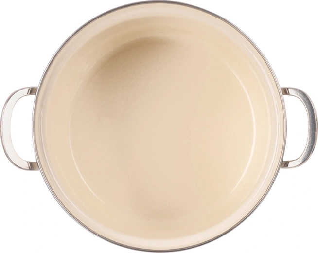 Body made of enamelled steel in cream with a floral decor, stainless-steel rim and handles for longer service life and easy cleaning.