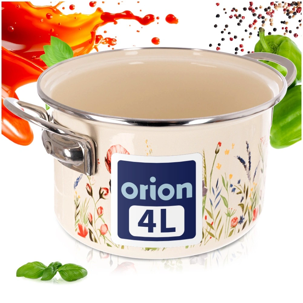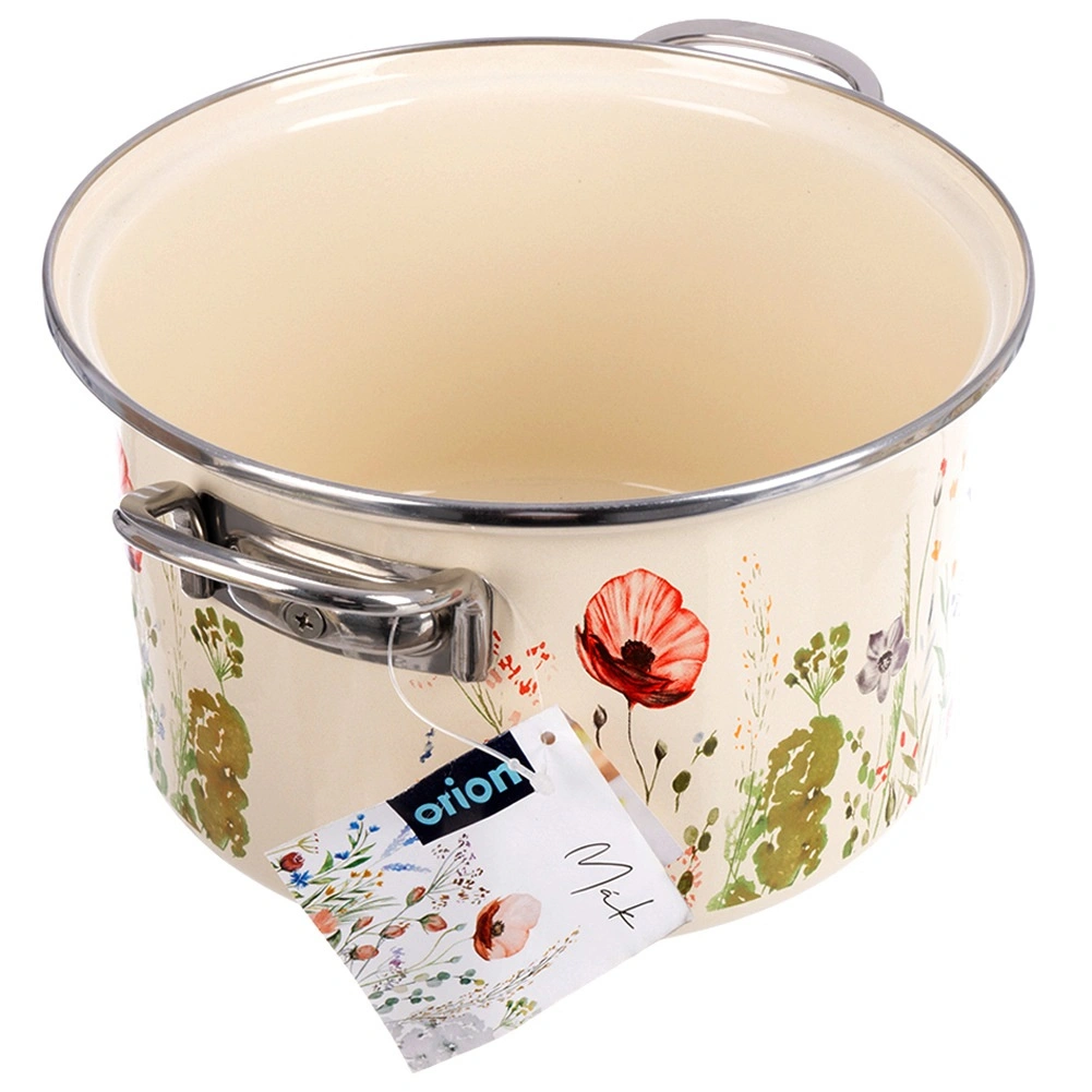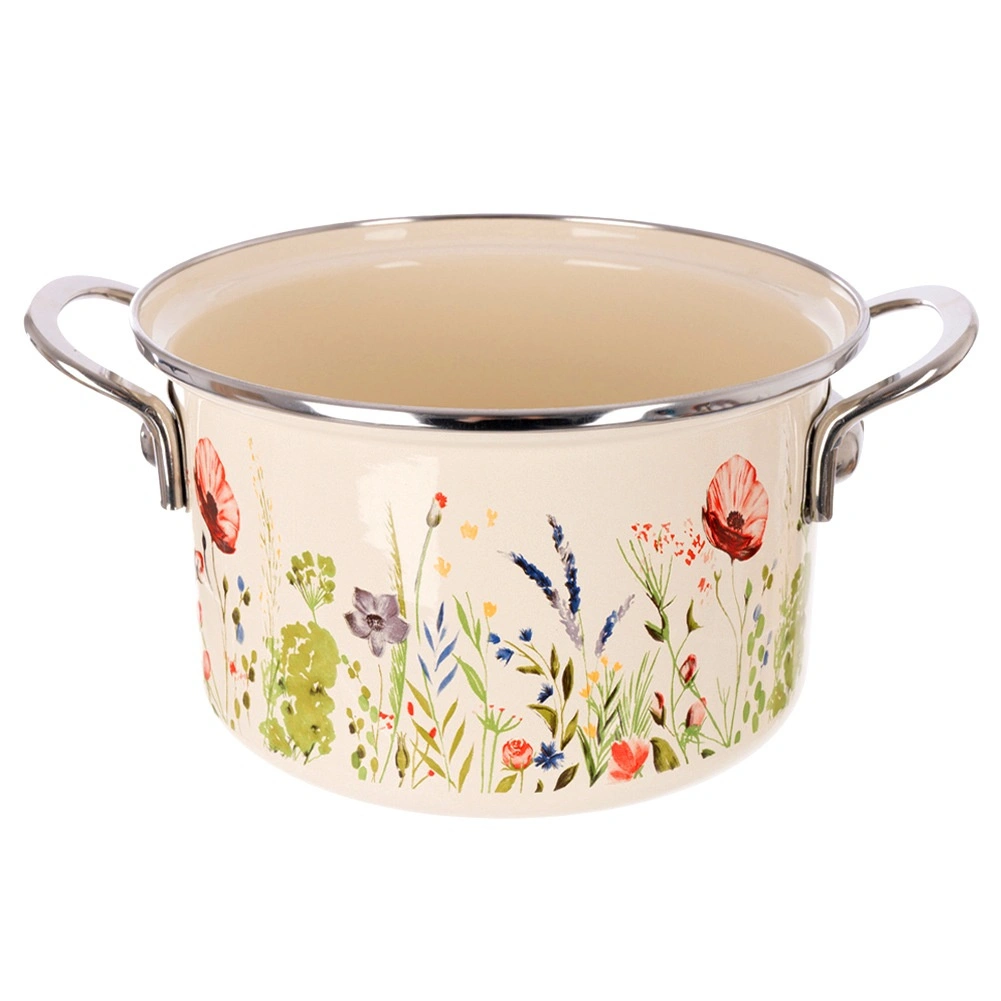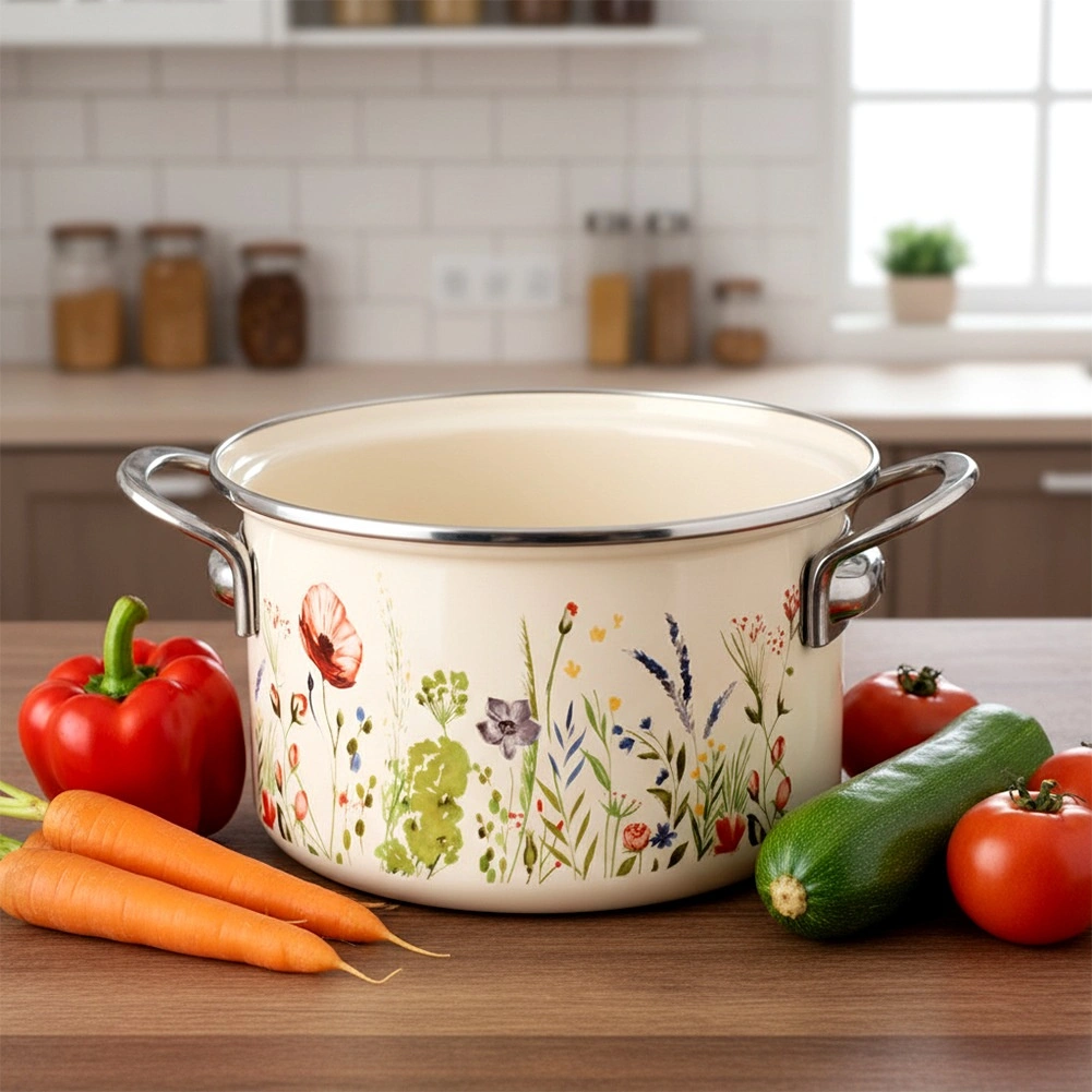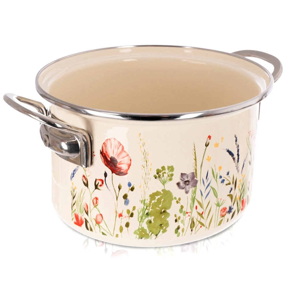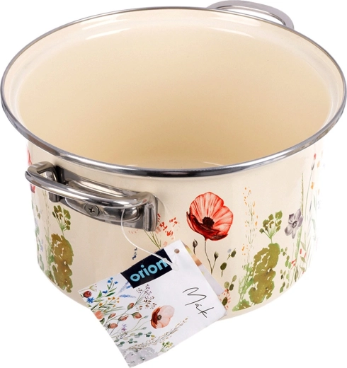 An elegant 4 l enamel pot in a cream color with a wildflower motif, ideal for everyday cooking and braising. Thanks to the stainless-steel rim and sturdy side handles, it’s easy to carry, suitable for all types of stovetops including induction and for use in the oven, and it’s dishwasher safe. Traditional enamel is hygienic, durable, and gentle even for allergy sufferers.