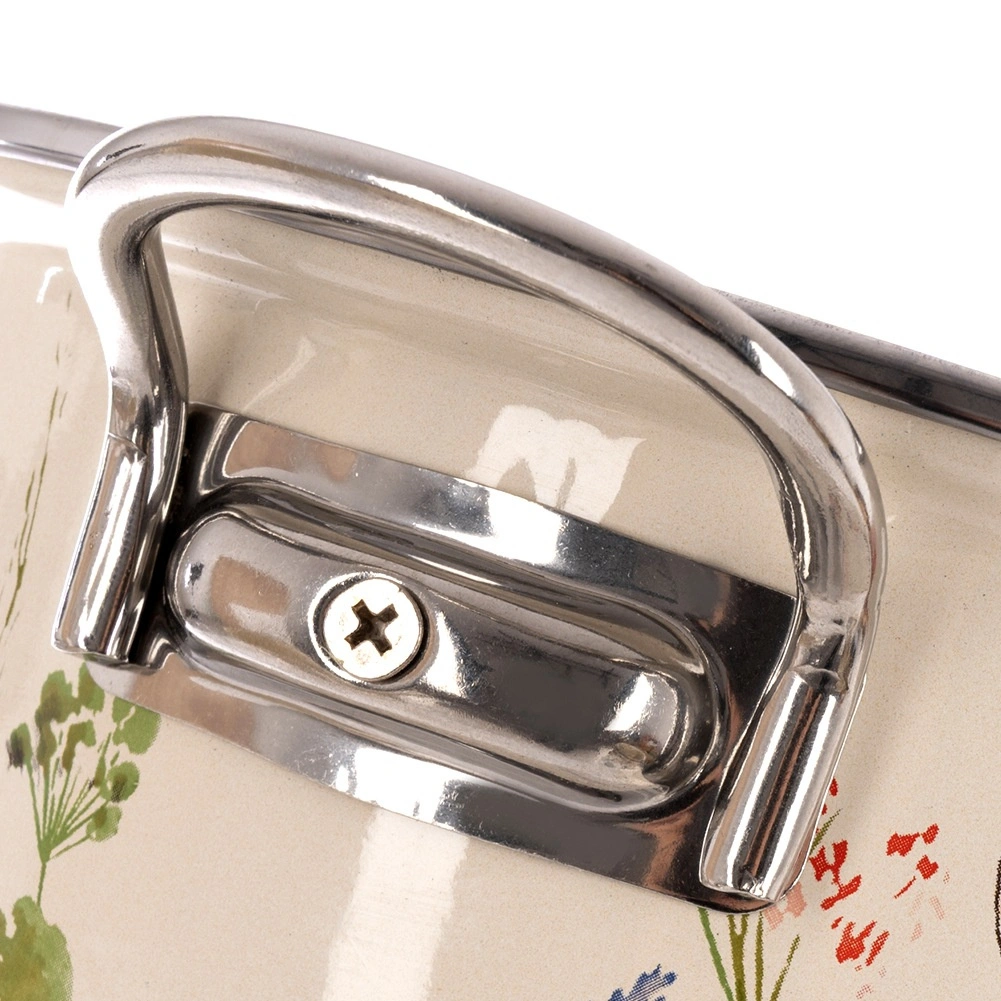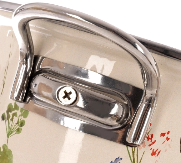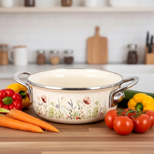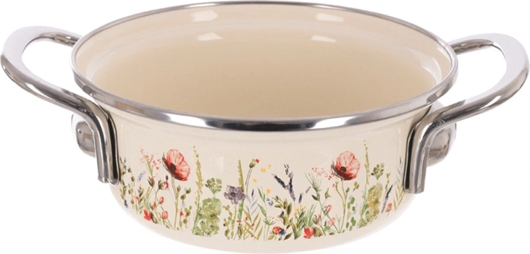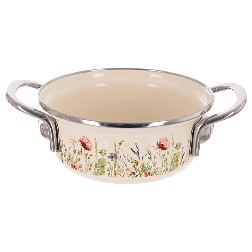 An elegant cream enamel pot with a wildflower motif, ideal for everyday cooking and braising. It offers a capacity of 950 ml, a diameter of 16 cm, and two sturdy stainless steel handles for safe handling. Suitable for all types of stoves including induction and for use in the oven, and dishwasher safe. The health-safe enamel is also gentle for allergy sufferers.