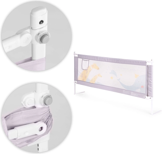 A practical 200 cm long bed rail for safe co-sleeping. It offers height adjustment for different mattresses, a fold-down top bar for easy access, breathable mesh with a cute animal motif, and a sturdy steel frame. It can be combined with additional rails to create a safe space. Includes a handy pocket for small items.