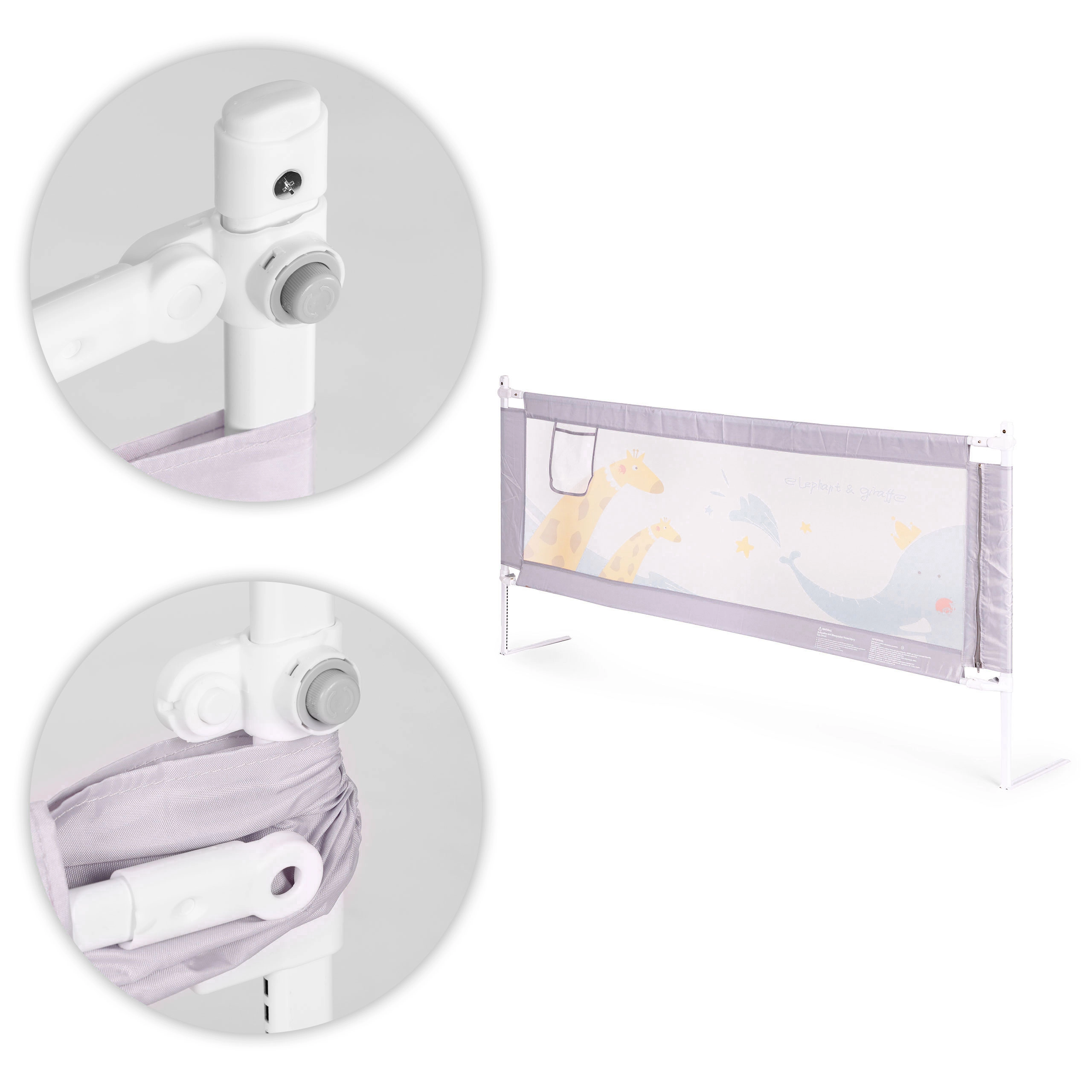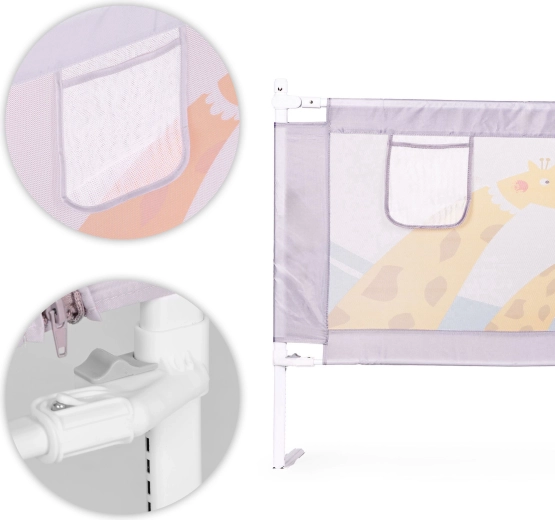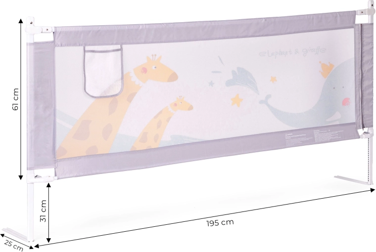 Thanks to universal mounting and the option to connect multiple rails, you can easily create a safe, cozy space on any side of the bed. Durable materials (steel, 210D Oxford fabric, polyester) ensure long service life and easy care—the cover can be removed and washed. The subtle animal motif suits any kids’ room, and the pocket keeps essentials like a pacifier, wipes, or a toy within reach.