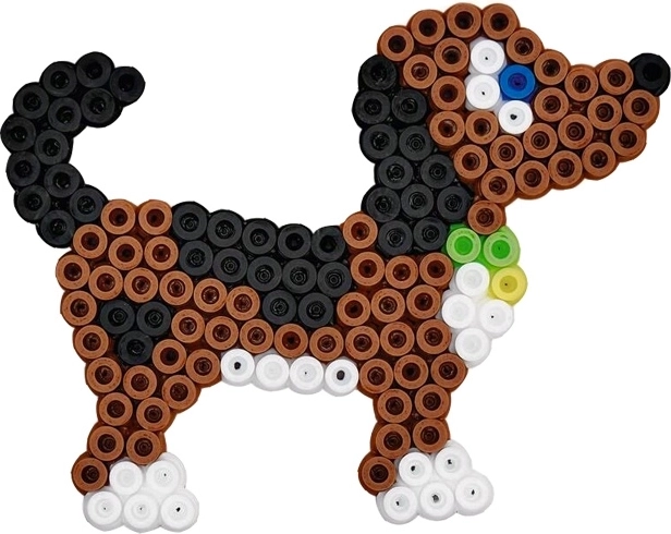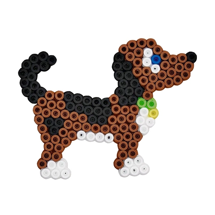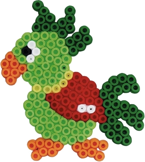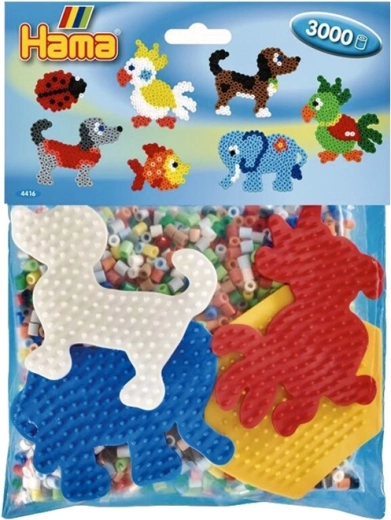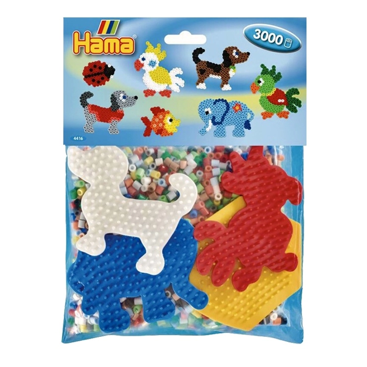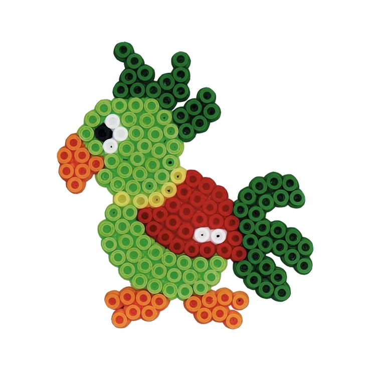 - 3000 iron-on beads, 4 pegboards (small hexagon, elephant, parrot, puppy), color template, ironing paper, instructions