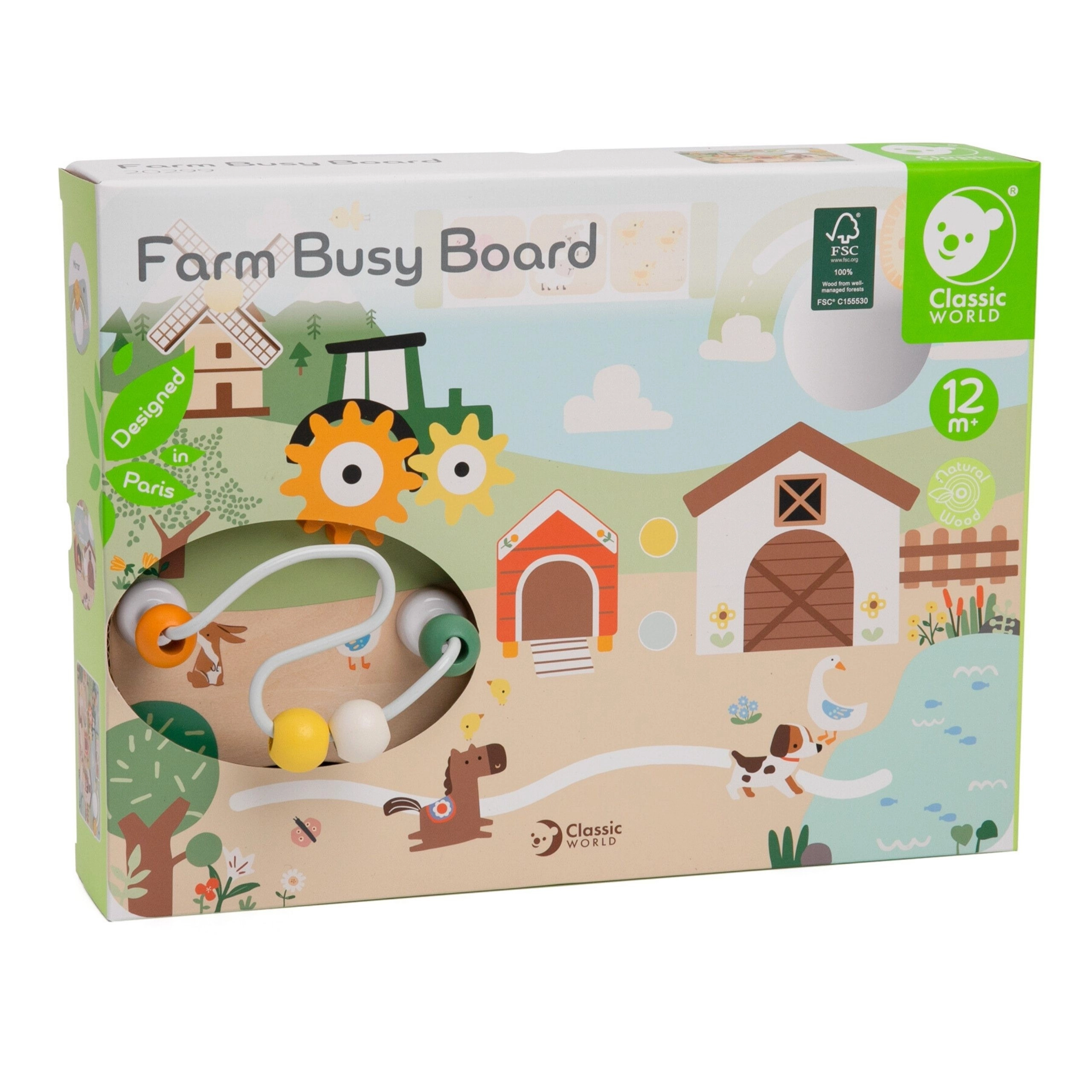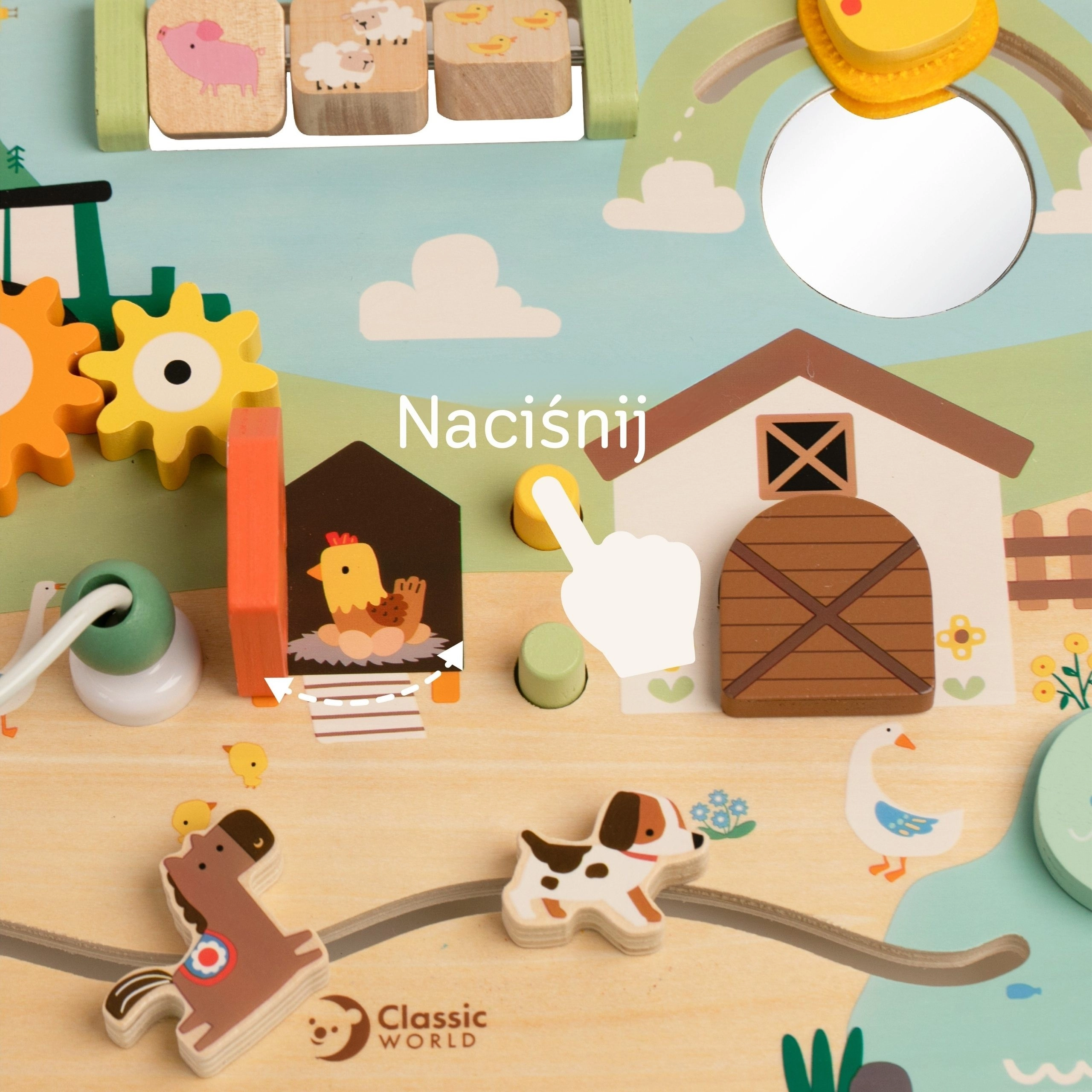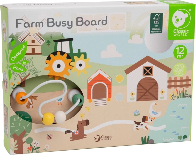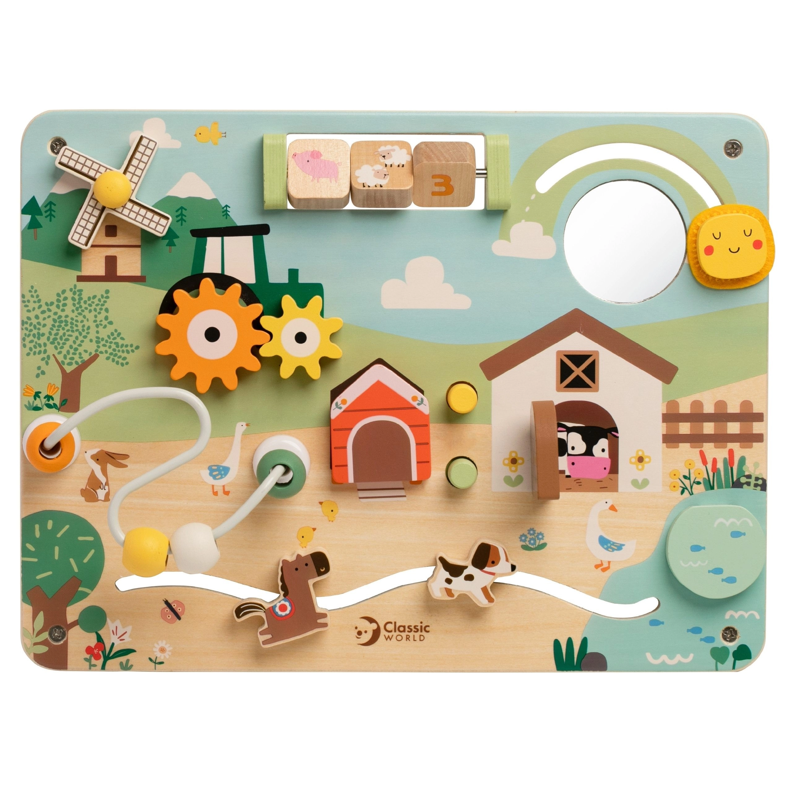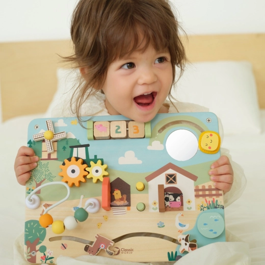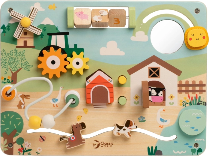 Discover fun and safe play with the farm-themed wooden activity board from Classic World. This colorful board offers interactive elements such as bead mazes, a spinning windmill, and opening doors with surprises. It excellently supports the development of fine motor skills, hand–eye coordination, and sensory stimulation for children from 12 months.