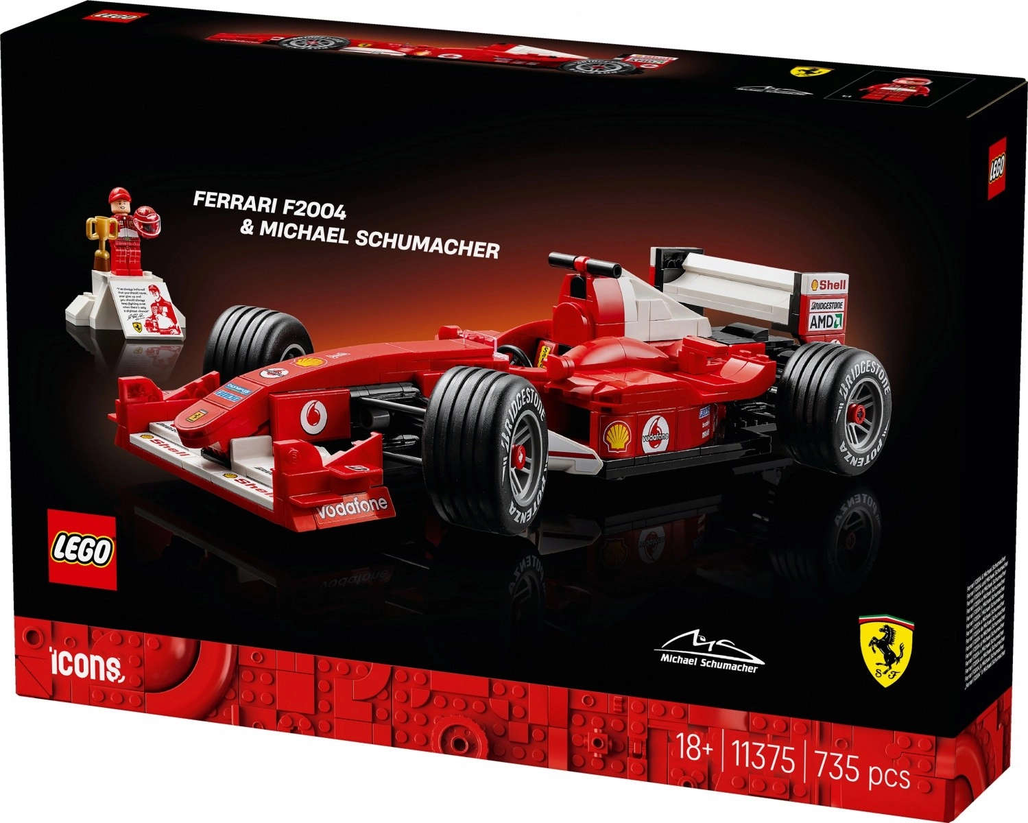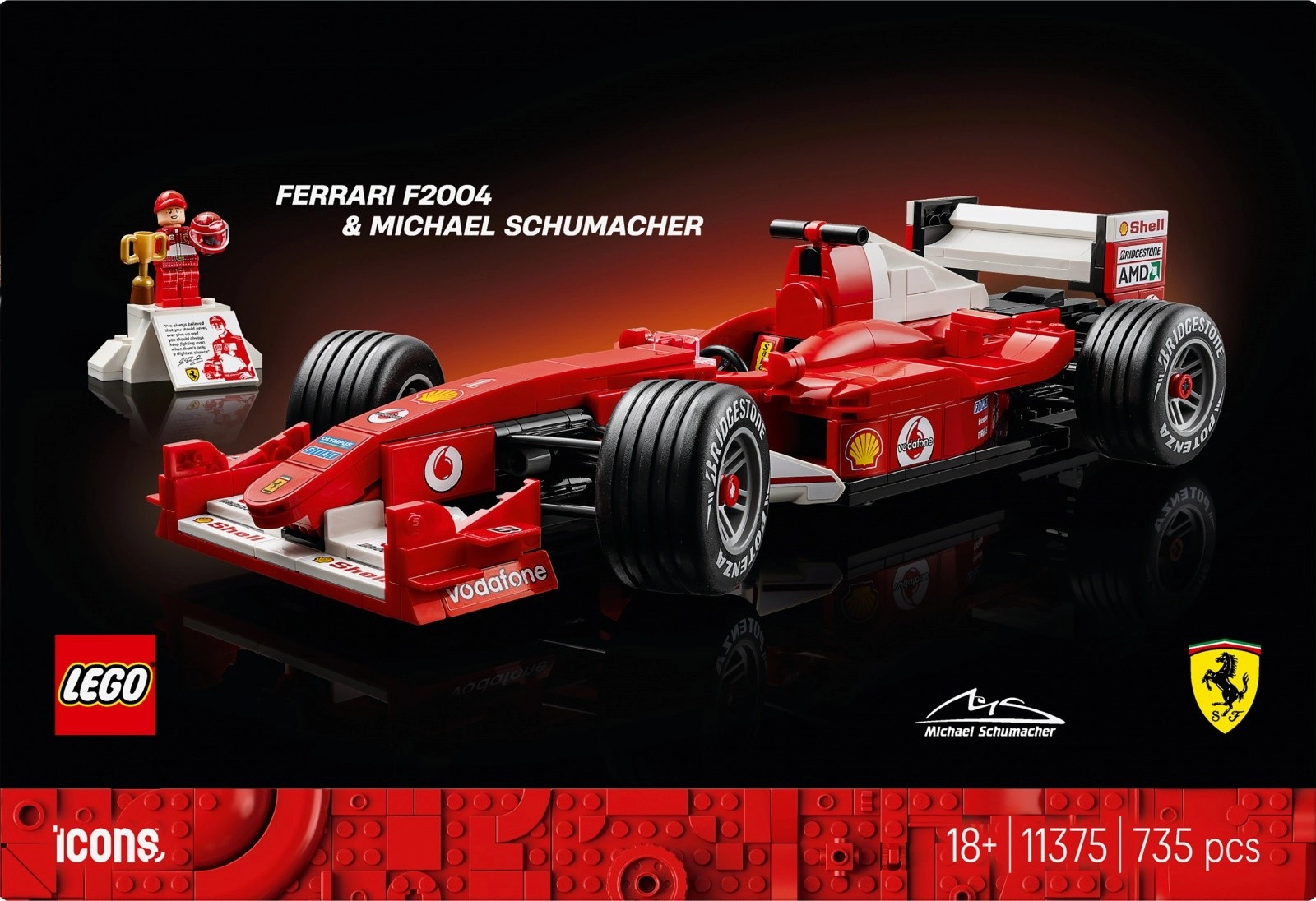 Celebrate the golden era of Formula 1 with the LEGO Icons Ferrari F2004 and driver Michael Schumacher. This detailed replica of the legendary single-seater features working steering, a realistic cockpit, a V10 engine, and printed stats on the display stand. Includes a Michael Schumacher minifigure with helmet, a trophy, and a podium with a quote – an ideal gift for F1 fans and collectors.