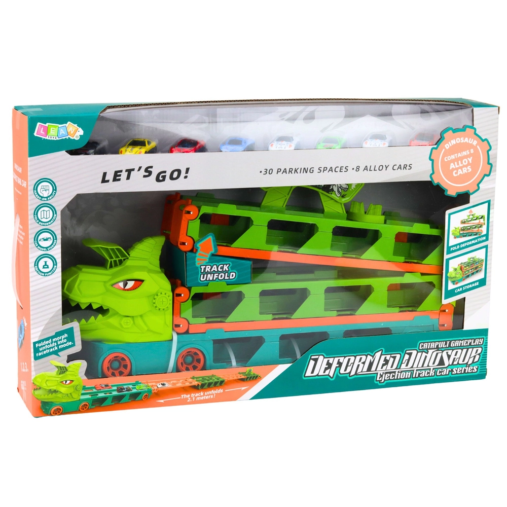- Dinosaur truck with track function, 8 cars, track pieces for assembly