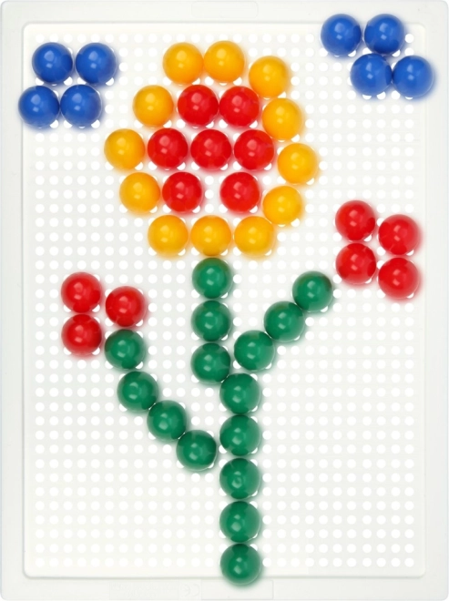 The set includes a plastic grid measuring 21 × 16 cm and 80 pegs with a diameter of 15 mm. Thanks to its compact size, it’s perfect for both home and travel. The mosaic does not include templates – encouraging free play and imagination.