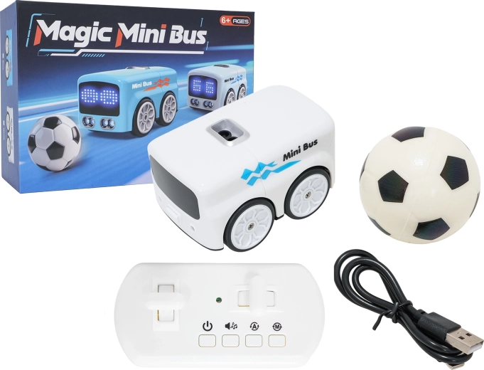 A fun RC mini bus for kids aged 6+ offers gesture and remote control, ball and line tracking, obstacle avoidance, LED animations, and cheerful melodies. A 3.7 V rechargeable battery and compact dimensions make it an ideal toy for indoor fun.
