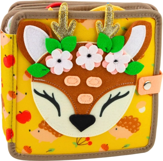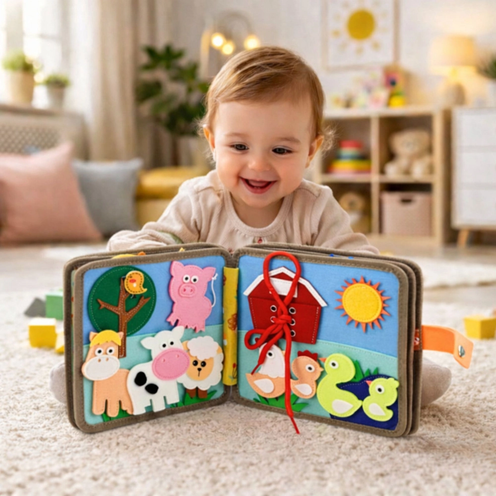 This soft and lightweight quiet book is designed for little hands. On its pages, children will find farm and forest animals, a tree, sun, barn, and other felt elements that can be detached, moved, inserted into pockets, and tied. In a playful way, they practice skills needed for the preschool age.