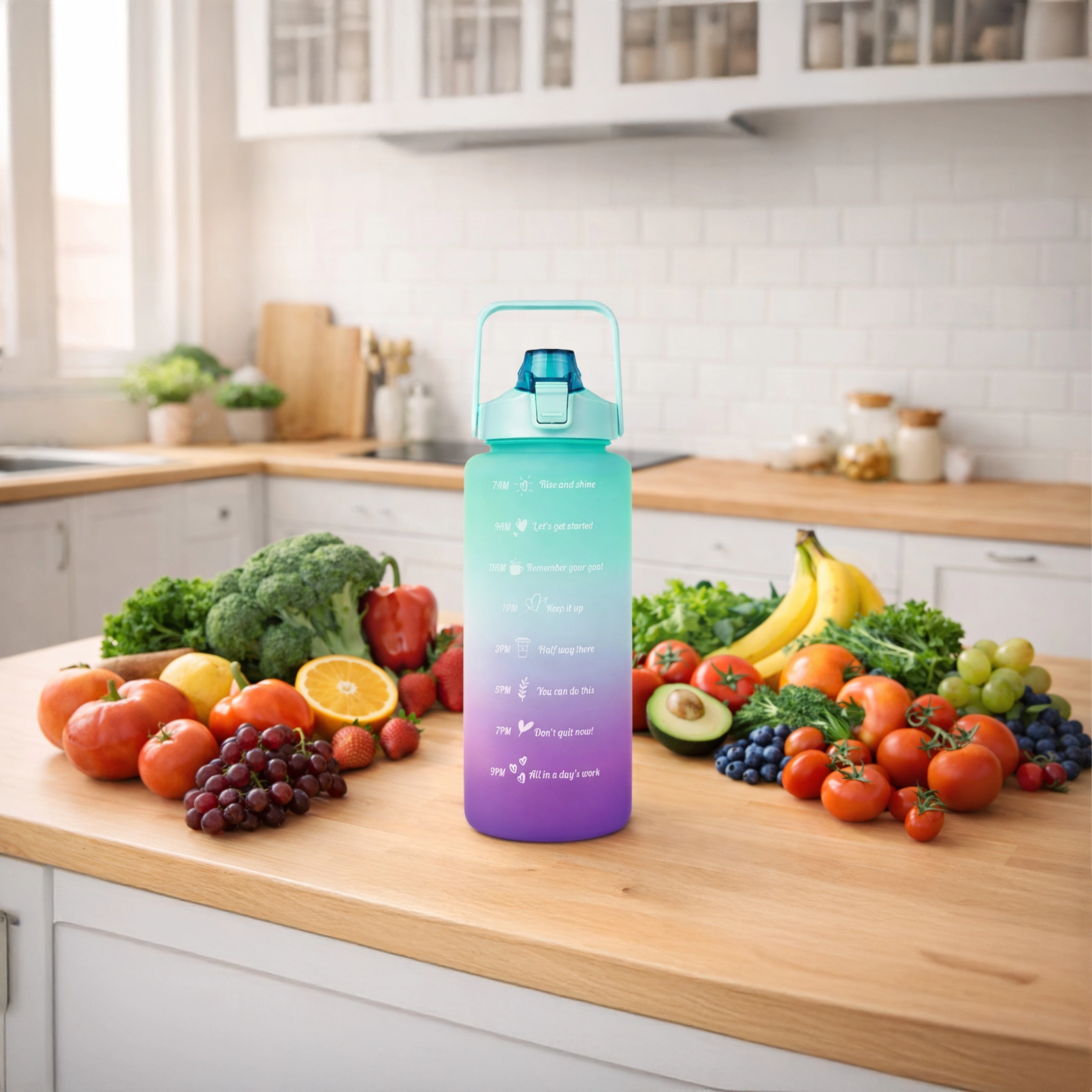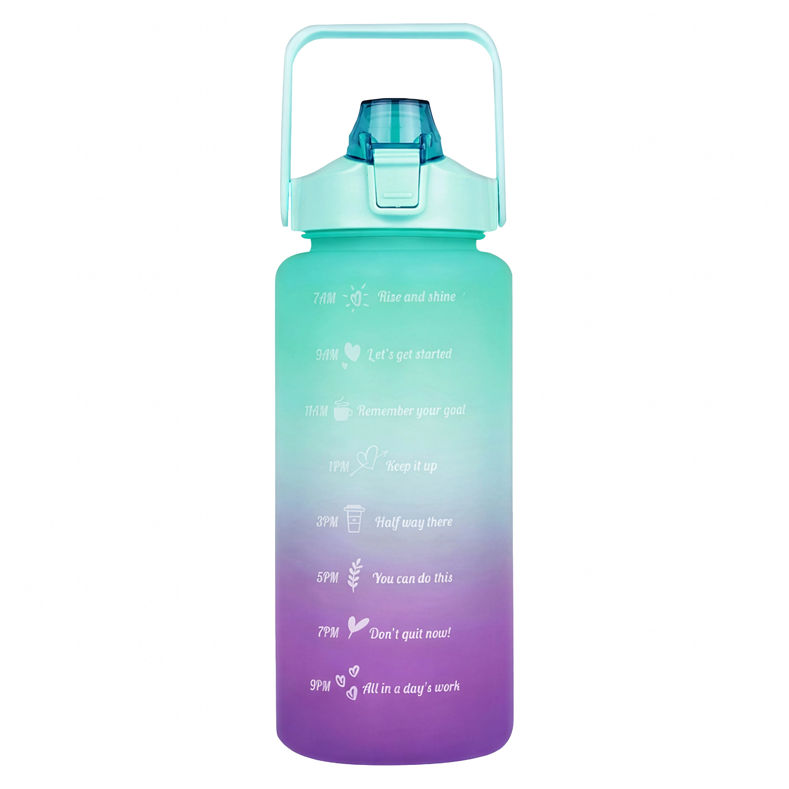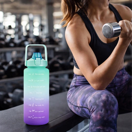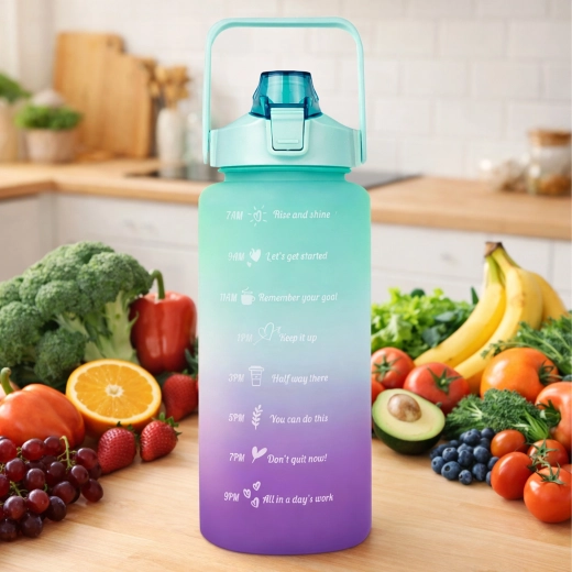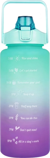 The large-capacity 2 L motivational water bottle helps you effortlessly track your daily fluid intake. Clear time markers with uplifting slogans on the bottle body guide you from morning to evening. The practical flip lid with straw provides quick, spill-free sipping, and the safety lock protects against accidental opening in your bag.