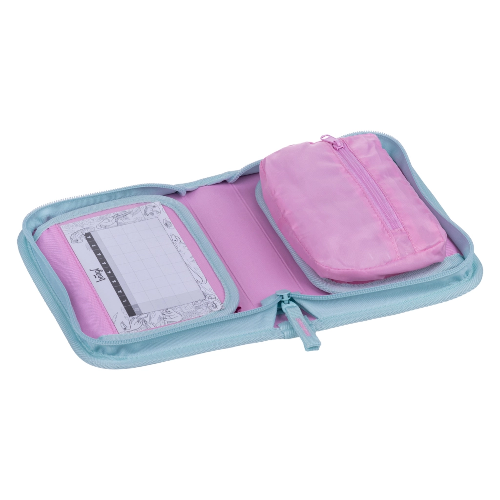 The interior layout includes sturdy elastic loops for pencils, crayons, and markers, a small pocket, a mesh pocket with a zipper, and a timetable window for quick orientation. Once opened, the pencil case can be fully unfolded so everything is instantly visible. The material with Global Recycled Standard (GRS) certification confirms environmental friendliness and high quality standards.