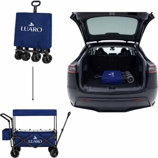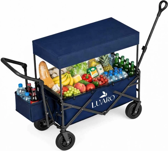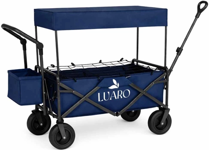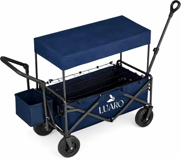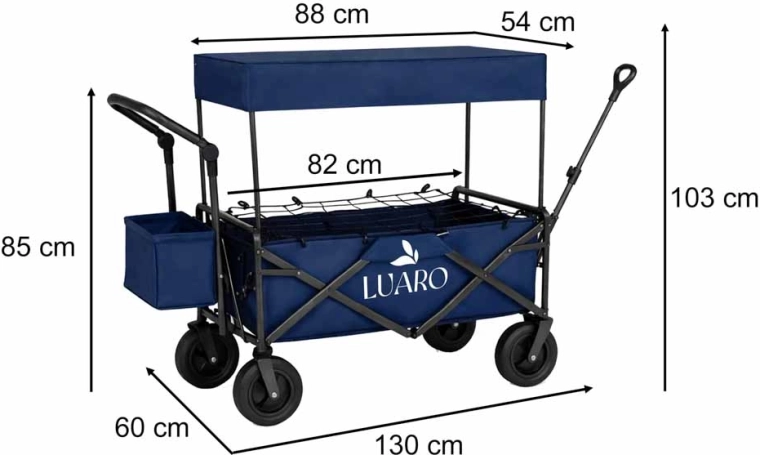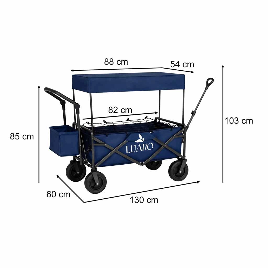 The versatile folding LUARO cart with canopy makes it easy to transport items to the beach, campsite, or around town. Thanks to its robust construction, wide all-terrain wheels, swiveling front casters, and adjustable handles, it’s easy to control. The practical canopy protects contents from sun and light rain, while the side pockets and basket keep essentials neatly organized.