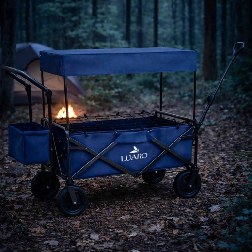 With the LUARO cart, you get a reliable helper for family outings, beach days, and camping. A sturdy steel frame and durable 600D Oxford fabric ensure stability and long service life, while large all-terrain wheels handle sand, grass, and paving. You can pull or push the cart, and the height-adjustable handles adapt comfortably to your height.