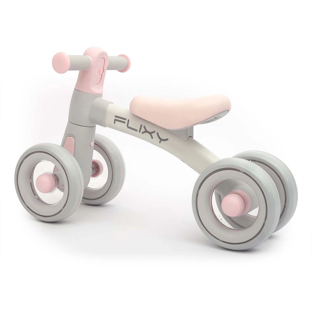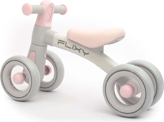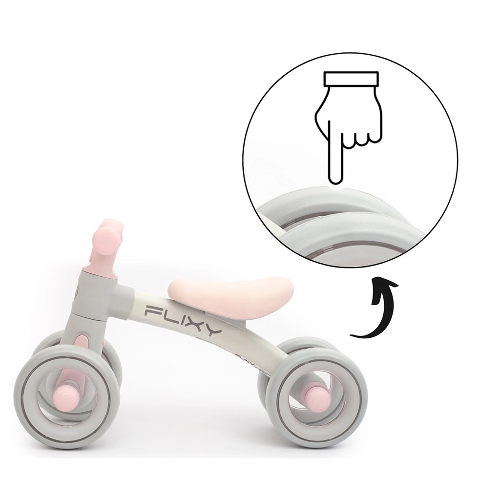 First rides without worries! The FLIXY children's balance bike with four stable wheels, a LED light in the handlebars, and a lightweight yet durable frame is ideal for kids from 12 months. It offers a quiet, smooth ride thanks to EVA wheels, an ergonomic saddle for comfort, and soft grips for a secure hold. Great for indoors and outdoors on flat surfaces.