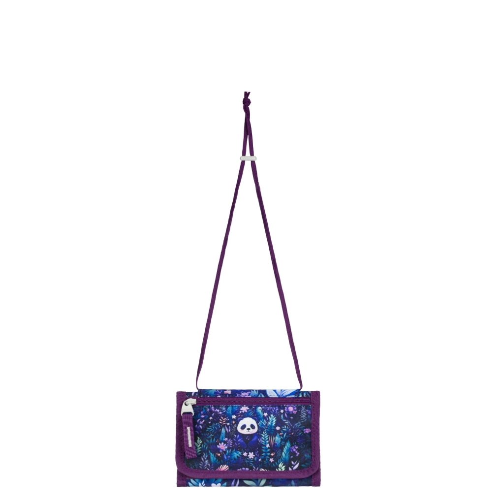 Single-compartment pencil case without contents, gym sack with carabiner, washable children’s apron, and neck wallet – all in the Jungle Panda motif.