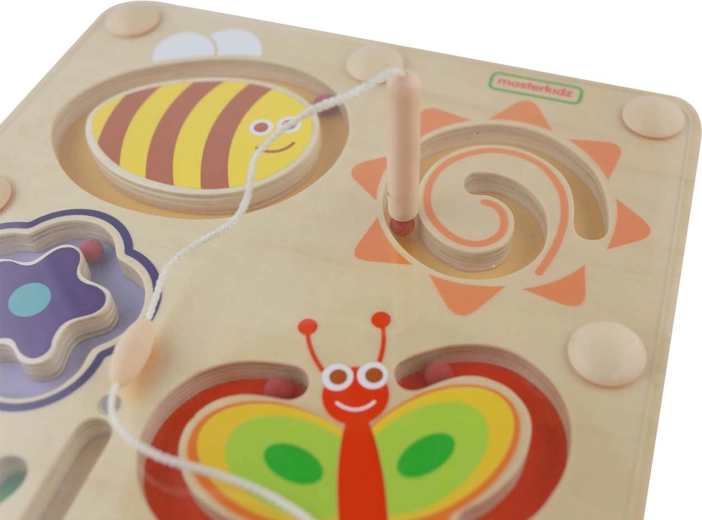 Discover joyful learning with the MASTERKIDZ wooden magnetic maze. With the attached stylus, children guide the balls through safe grooves and develop fine motor skills, hand–eye coordination, logical thinking, and patience. The sturdy wooden board, protective transparent cover, and vibrant colors featuring a bee, flower, butterfly, and sun make this toy safe and stimulating fun for every day.