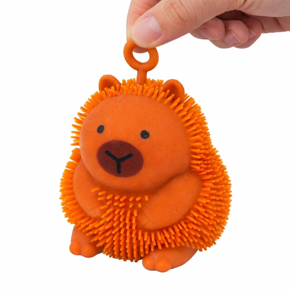 A cute sensory squishy in the shape of a capybara brings instant stress relief and lots of fun. Thanks to its soft and flexible material, you can squeeze it, stretch it, and bounce it, while a color LED flashes on impact. The pleasant texture with gentle bumps stimulates touch, and the strap makes it easy to hold or hang.